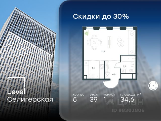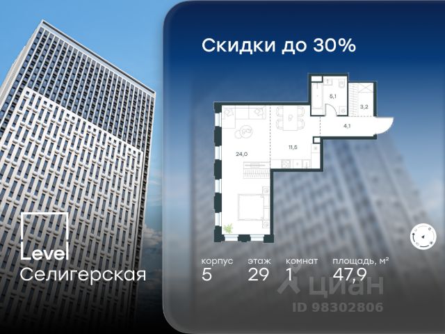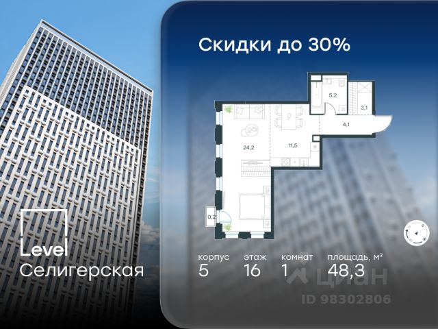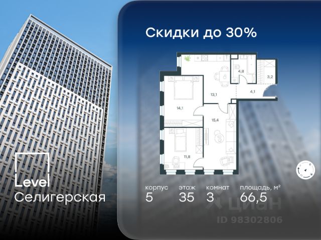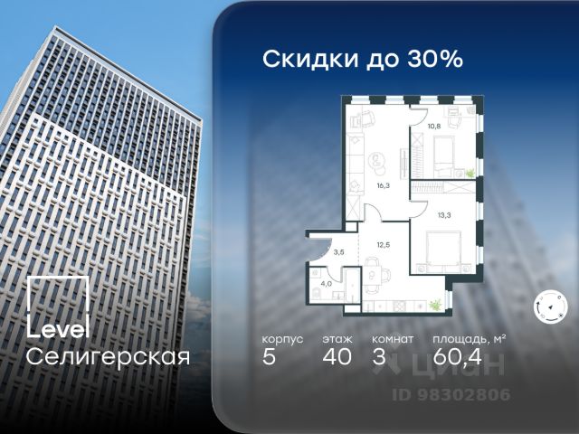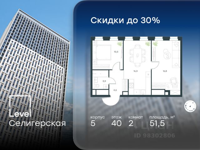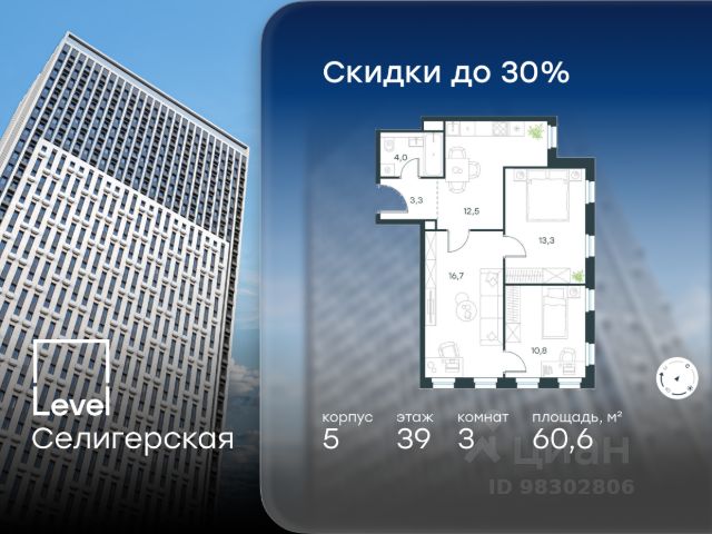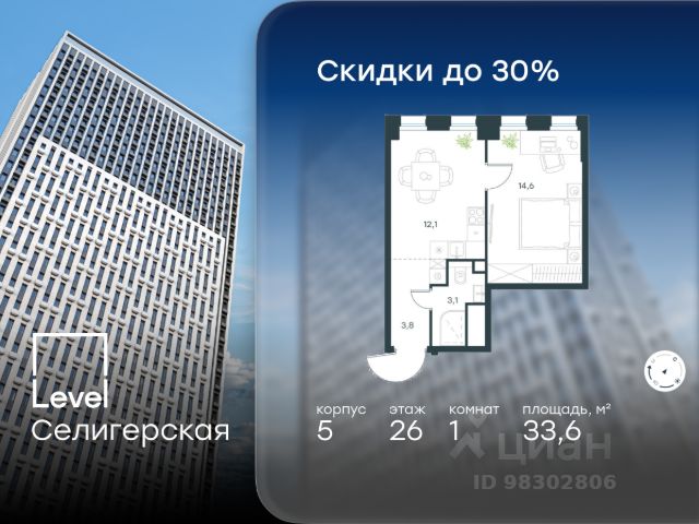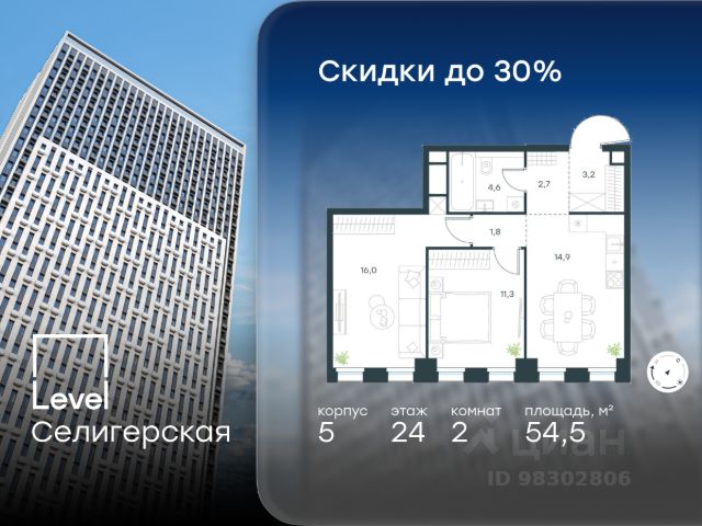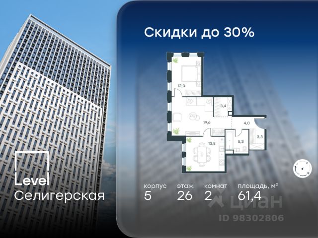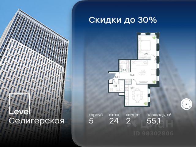 Цена указана с учётом скидки при 100%-й оплате, несубсидированной ипотеке, рассрочке (кроме программы "Рассрочка 0%"). В жилом квартале, расположенном в южной части района Западное Дегунино, продаётся 2-комнатная квартира площадью 55.50 кв.м без отделки. Квартира расположена на 7 этаже 40-этажного корпуса 5 в жилом комплексе комфорт-класса Level Селигерская (компания Level Group/Левел групп). Отличная транспортная доступность: - 10 мин. пешком до станции метро "Селигерская" от корпусов 1-й очереди; - 10 мин. пешком до станции метро "Верхние Лихоборы" от корпусов 2-й очереди; - 20 мин. пешком до станции МЦД-3 "Моссельмаш"; - 11 мин. на авто до МКАД; - 13 мин. на авто до ТТК; - 16 мин. на авто до Садового кольца. Расположение Район отличается богатой социальной инфраструктурой: школы, детские сады, поликлиники, магазины, фитнес-клубы, торговые центры - всё близко к дому. Рядом с Level Селигерская расположено 5 парковых зон. В 3 минутах от дома расположен перспективный сквер-парк. В 10 минутах пешком находится парк им. Святослава Фёдорова, в 13 минутах на велосипеде - парк "Ангарские пруды". В 7-11 минутах на автомобиле - два крупных природных объекта: Тимирязевский парк и Главный ботанический сад Российской академии наук. Благоустройство Внутренние дворы жилого комплекса огорожены от машин, а их функциональное наполнение отличается в зависимости от очереди строительства. На территории 1-й очереди будут: детская площадка, воркаут-зона, места для тихого отдыха и активных игр, а также сенсорный сад и большой луг. Во 2-й очереди жителей ждут уютные навесы с качелями, павильон-читальня, волейбольная площадка, беседки, а также детские и спортивные площадки. Технологии и инженерия Для входа на территорию комплекса предусмотрен единый ключ доступа. Все общественные зоны оснащены камерами видеонаблюдения, по заявке собственнику предоставляется возможность просмотра изображения отдельных видеокамер на его мобильном устройстве. При въезде в паркинг функционирует система распознавания госномеров. Кроме того, для комфорта жителей создано мобильное приложение, с помощью которого можно удаленно контролировать доступ на придомовую и жилую территории. Другие преимущества жилого комплекса - Высокая освещенность квартир: в большинстве из них не меньше трёх окон; - Супермаркет, магазины, кафе, пекарни и многое другое на первых этажах домов; - Частный детский сад; - Стильные дизайнерские лобби с высокими потолками до 4,9 м и окнами в пол, для питомцев предусмотрена лапомойка; - 20+ планировочных решений: от студий до семейных квартир; - С каждого этажа дома на лифте можно спуститься в подземный отапливаемый паркинг.