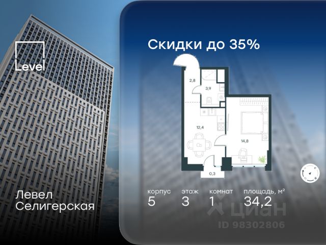 Цена указана с учётом скидки при 100%-й оплате, несубсидированной ипотеке, рассрочке (кроме программы "Рассрочка 0%"). В жилом квартале, расположенном в южной части района Западное Дегунино, продаётся 1-комнатная квартира площадью 34.20 кв.м без отделки. Квартира расположена на 3 этаже 40-этажного корпуса 5 в жилом комплексе комфорт-класса Левел Селигерская (компания Level Group/Левел групп). Отличная транспортная доступность: - 10 мин. пешком до станции метро "Верхние Лихоборы"; - 15 мин. пешком до станции метро "Селигерская"; - 20 мин. пешком до станции МЦД-3 "Моссельмаш"; - 11 мин. на авто до МКАД; - 13 мин. на авто до ТТК; - 16 мин. на авто до Садового кольца. Расположение Район отличается богатой социальной инфраструктурой: школы, детские сады, поликлиники, магазины, фитнес-клубы, торговые центры - всё близко к дому. Рядом с Левел Селигерская расположено 5 парковых зон. В 3 минутах от дома расположен перспективный сквер-парк. В 10 минутах пешком находится парк им. Святослава Фёдорова, в 13 минутах на велосипеде - парк "Ангарские пруды". В 7-11 минутах на автомобиле - два крупных природных объекта: Тимирязевский парк и Главный ботанический сад Российской академии наук. Благоустройство Внутренние дворы жилого комплекса огорожены от машин, а их функциональное наполнение отличается в зависимости от очереди строительства. На территории 2-й очереди жителей ждут уютные навесы с качелями, павильон-читальня, волейбольная площадка, беседки, а также детские и спортивные площадки. Технологии и инженерия Для входа на территорию комплекса предусмотрен единый ключ доступа. Все общественные зоны оснащены камерами видеонаблюдения, по заявке собственнику предоставляется возможность просмотра изображения отдельных видеокамер на его мобильном устройстве. При въезде в паркинг функционирует система распознавания госномеров. Кроме того, для комфорта жителей создано мобильное приложение, с помощью которого можно удаленно контролировать доступ на придомовую и жилую территории. Другие преимущества жилого комплекса - Высокая освещённость квартир: в большинстве из них не менее трёх окон; - Супермаркет, магазины, кафе, пекарни и многое другое на первых этажах домов; - Частный детский сад; - Стильные дизайнерские лобби с высокими потолками до 4,3 м. и окнами в пол, для питомцев предусмотрена лапомойка; - 30+ планировочных решений: от компактных студий до просторных семейных квартир; - С каждого этажа дома на лифте можно спуститься в подземный отапливаемый паркинг."
