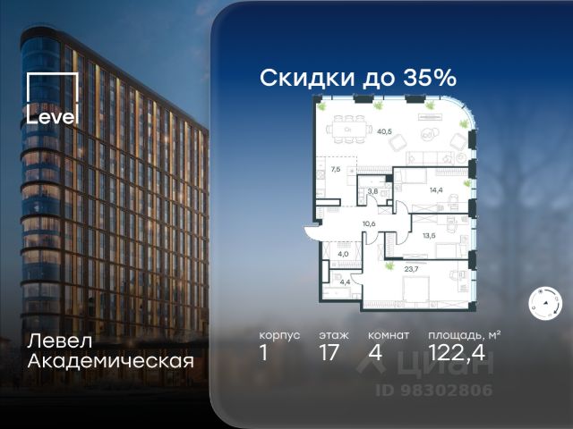 Цена указана с учётом скидки при 100%-й оплате, несубсидированной ипотеке, рассрочке (кроме программы "Рассрочка 0%"). В Академическом районе продаётся 3-комнатная квартира площадью 71.30 кв.м без отделки. Квартира расположена на 19-м этаже 19-этажного жилого комплекса бизнес-класса Левел Академическая (компания Level Group). Площади помещений определены кадастровым инженером по результатам обмеров. Отличная транспортная доступность: - 1 мин. пешком до станции метро "Академическая"; - 4 мин. на автомобиле до ТТК; - 8 мин. на автомобиле до Садового кольца; - 13 мин. на автомобиле до Кремля. Продуманный архитектурный проект: - современная архитектура от бюро UNK project; - высокие потолки в квартирах до 6,62 м; - окна в пол высотой 2,5-2,68 м с панорамным видом на МГУ, Москва-Сити и другие доминанты Москвы; - квартиры с моллированным остеклением - радиусные окна открывают увеличенный угол обзора; - более 20 вариантов планировочных решений; - уникальные квартиры с собственным патио и возможностью обустройства дровяного камина; - квартиры сдаются без отделки, что открывает свободу для создания интерьера по своему вкусу. Расположение: Камерный проект из 1 корпуса расположен тихом зеленом районе Москвы, в непосредственной близости к центру города. В округе построено 80 детских садов, 50 школ и 30 вузов, 7 из которых входят в топ100 вузов России: МГУ, МГИМО, РАНХиГС, МИСИС, РУДН, РЭУ им. Плеханова и РГУ нефти и газа им. Губкина. Этот район буквально утопает в зелени парков, начиная с уютного Академического в 6 минутах пешком и заканчивая одним из крупнейших в городе парком 50-летия Октября (12 минут на автомобиле). Общая площадь природных объектов в радиусе 2-6 км от дома - 476,5 га. Внутренняя инфраструктура: На территории жилого комплекса Левел Академическая откроется собственный торговый центр, а для отдыха жителей будут созданы общественные пространства: комфортное лобби с дизайнерской отделкой, окнами в пол и потолками высотой 4,5 м, а также две благоустроенные зоны - территория по периметру здания и пространство на стилобате. Во дворе на стилобате предусмотрены детская и спортивная площадки, коворкинг и лаунж-зона на открытом воздухе. Стилобат украсят скульптуры животных - жирафа, зайца и волка, которые станут ярким акцентом внутреннего двора жилого комплекса Левел Академическая, подчеркивая близость к музею Дарвина. Процент озеленения территории - 58%. Технологии и безопасность: Жителей жилого комплекса Левел Академическая не коснется ежегодное отключение горячей воды благодаря собственным центральным водонагревателям. Безопасность гарантирует круглосуточная охрана, безлимитный вайфай, круглосуточное видеонаблюдение. Удобное перемещение внутри комплекса будут обеспечивать 5 лифтов с доступом в паркинг с жилых этажей. п Продам квартиру в новостройке в районе Академический в Москве.