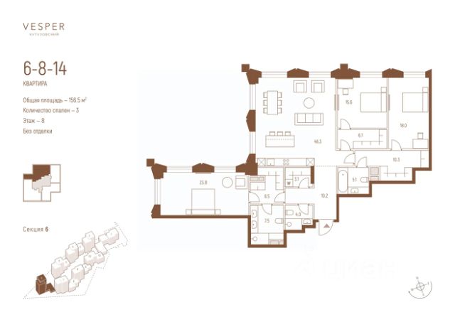 Продается квартира 4-спальнями без отделки, в корпусе 10.1 общей площадью 181 кв.м. на 11 этаже. Знаковый проект для ценителей комфортной городской среды от Vesper. Квартал площадью 3,7 га расположен на Кутузовском проспекте и воплощает новую концепцию идеально сбалансированного места для жизни. Благодаря удачному расположению и развитой транспортной инфраструктуре отсюда одинаково быстро добираться как до Кремля и ММДЦ "Москва-Сити", так и до Рублево-Успенского шоссе. Планировочные решения проекта Vesper Кутузовский включают широкую линейку жилых форматов и подойдут для самых взыскательных резидентов: помимо базовых вариантов квартир доступны эксклюзивные лоты — пентхаусы с террасами и квартиры с патио. Продуманная приватная инфраструктура, собственный ландшафтный парк, близость магазинов и ресторанов делают Vesper Кутузовский достойным выбором для самых взыскательных клиентов: как для тех, кто любит уединение, так и для резидентов, которые стремятся быть в центре событий. Концепция жилого квартала разработана ODA Architecture. Разная высотность 10 строений, плавные линии и главный паттерн из арок, размер которых меняется в зависимости от дома и этажа, создают визуальный ритм квартала и делают его легким и элегантным, наполненным солнечным светом и воздухом. Купить квартиру в новостройке в районе Дорогомилово в Москве.