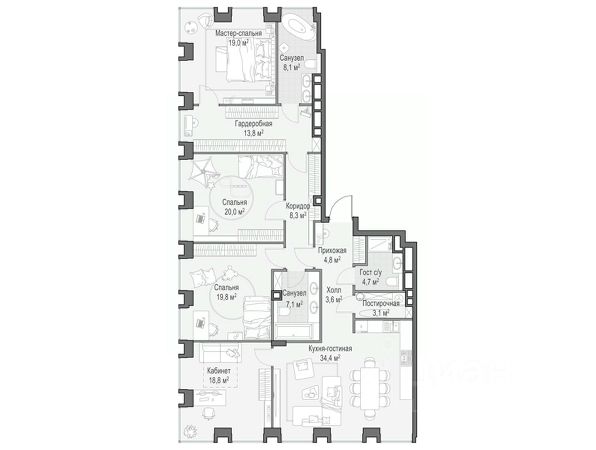Продаётся 4 - комнатная квартира в готовом доме (Корпус 7), общей площадью 247.1 кв.м., на 21 этаже. О жилом комлексе Жилой квартал Lucky - это переосмысление и регенерация общественно-делового кластера площадью более 4.5 гектаров в центре Москвы. О застройщике Девелопер проекта Vesper специализируется в премиальном сегменте клубной жилой недвижимости. Портфель компании включает 22 проекта в Москве и странах Европы. Актуальные архитектурные проекты, индивидуальный дизайн, передовые технологии, качественные материалы и лучшие мировые практики воплощены в каждом доме компании. Расположение и транспортная доступность Квартал расположен на пересечении улиц 2-ая Звенигородская и Костикова, в 200 метрах от метро "Улица 1905 года". В непосредственной близости от парков, Москвы- реки, Сити и Садового кольца формируется идеальная среда для семейного проживания в мегаполисе. Архитектура Визуально квартал разделен на две части: верхний город с новыми высотными жилыми домами и нижний город с общественным пространством для инфраструктуры, где будет располагаться новый социокультурный кластер площадью около 10 000 кв. м. Верхний город будет состоять из восьми жилых домов: семь 21-этажных башен и одно здание высотой 15 этажей. В восьми новых домах расположены 618 квартир. На каждом этаже 3-4 квартиры, большая часть которых имеет ориентацию на 2-3 стороны света. Из панорамных окон открываются виды на набережную Москва-реки, Сити и близлежащие парки. Знаковая архитектура, продуманные планировочные решения, изысканная отделка, инновационные инженерные решения воплощены в квартале Lucky. Инфраструктура В квартале представлена инфраструктура для всей семьи: парки и скверы, билингвальный детский сад La Berezka, собственный 600 м. игровой парк для детей, фитнес с подогреваемым бассейном на крыше, рестораны, кафе и магазины органических продуктов. В шаговой доступности от квартала расположены лучшие рейтинговые школы. Купить квартиру в новостройке рядом с метро Беговая.