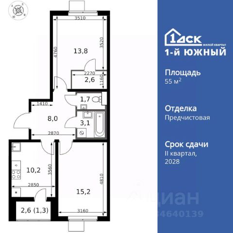 Прямая продажа от застройщика! Жилой Комплекс класса Комфорт Плюс. Продаётся 2-к квартира номер 310 общей площадью 55.9 кв.м. на 6-м этаже 25 этажного здания. Предчистовая отделка. Цена с учётом скидки. Особенности квартиры: - МЦД-5 в пешей доступности - Квартал с южным садом - Свои 3 детских сада и 2 большие школы - Организуем показ в удобное для вас время! - Мастер-зона с гардеробной. Просторное место для отдыха и удобного хранения вещей. - Распашная планировка - отличное сочетание удобства и свободы. - Раздельный санузел - больше удобства для всех членов семьи. - Линейная кухня - функциональность и практичность в одном решении. - Гардеробная - удобство для хранения и организации вещей. - Лоджия - уютное место для отдыха и тишины. Квартира с предчистовой отделкой. Вам не придется заниматься черновыми и трудоёмкими работы, а чистовую отделку и дизайн - сделайте на свой вкус. Информация о комплексе: ЖК от 1-го ДСК: евро формат, большие застеклённые лоджии и умный дом. Управляйте светом и техникой через Яндекс.Станцию, защита от протечек. Удачная локация: транспортная доступность и природа рядом. В каждом дворе - плодовые деревья, весной цветут яблони и груши, зимой - лыжня среди заснеженного леса. Транспортная доступность: - Общественный транспорт: Действующая ж/д станция Булатниково (в перспективе будущая МДЦ D5) в пешей доступности, всего 10-12 минут. - Личный автотранспорт: Удобный выезд на трассу М4-Дон в сторону Москвы и области 850 м, до МКАД - 1 км Внутренняя инфраструктура: "1-й Южный": продуманные подъезды с панорамным остеклением и входами с улицы и двора. Безбарьерная среда для родителей с колясками и маломобильных жителей. В каждом подъезде - колясочные, лапомойки, санузлы, место для консьержа. На территории: 3 детских сада и 2 школы под окнами, пешеходный бульвар-дендрарий для прогулок, центральная площадь для мероприятий. Всё для комфортной жизни, общения и активностей в шаговой доступности. Квартира с предчистовой отделкой - ваш дизайн без черновых работ