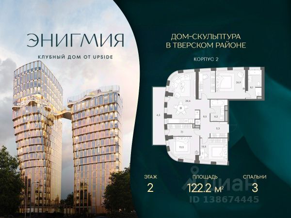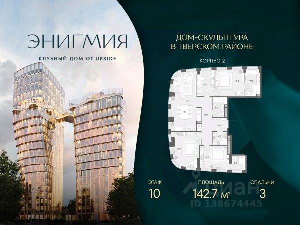 Просторная угловая квартира площадью 157,03 м² с панорамными видами на Садовое кольцо, Новослободскую ул. и во двор. Продуманная планировка с двумя мастер-спальнями и тремя санузлами. ЭНИГМИЯ — дом-скульптура, притягивающий взгляды и раскрывающий секрет красивой жизни. Загадочная красота окружает каждого, кто здесь живет, проявляясь в каждой детали. ЗНАКОВЫЙ ИСТОРИЧЕСКИЙ РАЙОН С АУРОЙ ПОДЛИННОЙ МОСКВЫ. ЭНИГМИЯ вписана в историческое окружение, как редкий камень в достойную оправу. Ее силуэт возносится над историческим центром, притягивая восхищенные взгляды своей совершенной формой и невероятным парящим мостом. • ЦАО, Тверской район • 3 минуты на автомобиле до Садового кольца АРХИТЕКТУРА, СОЗДАННАЯ ВОСХИЩАТЬ. Два элегантных корпуса высотой 15 и 19 этажей объединяет парящий мост-сад на уровне 16-го этажа, создающий редкий для центра столицы архитектурный образ. Авторский почерк бюро ADM узнается в каждой линии: плавные контуры фасадов расширяются снизу вверх, очаровывая выразительной пластикой света и тени, изгибы моста напоминают реку, застывшую в небе. УНИКАЛЬНЫЙ ПАРЯЩИЙ-ДВОР САД НА ВЫСОТЕ. На высоте 57 метров раскинулся парящий двор-сад — частный оазис в центре мегаполиса. Это пространство, где архитектура встречается с природой: много зелени, чистый и прозрачный воздух, насыщенный кислородом, обилие солнечного света и ничем не загороженные виды. • Уникальное игровое пространство KidSide, разработанное профильным "Бюро Scape"; • ViewSide кинотеатр; • Просекко-бар для вечерних встреч с видом на закат; • Зона отдыха с шезлонгами и гамаками; • Пространство для занятий йогой с видами на восход солнца; • Корнер для пикников с гриль-зоной. ДВА УРОВНЯ ВДОХНОВЕНИЯ UPSIDE CLUB. Еще одна грань красивой жизни — уникальный Upside Club. Upside Club — это пространства для отдыха и общения, где соседи становятся друзьями. • На высоте: PartySide, GameSide, FitSide, BeautySide, MeetSide, KidSide, ViewSide. • В лобби: приватный фитнес-клуб, бьютирум, переговорная, детская игровая комната. РОСКОШЬ КЛУБНОЙ ЖИЗНИ. Всего 92 резиденции образуют камерное сообщество тех, кто ценит тишину, комфорт и безупречную организацию жизни. • Управляющая компания с богатым опытом в элитном классе; • Сервис отельного уровня 24/7; • Valet- и bellman-сервис; • Арт-консьерж; • Отдельный вход для курьеров и помещение для хранения посылок; • Сервисные лифты. КОМАНДА ПРОЕКТА: • CTR Construction генеральный подрядчик; • ADM архитектурное бюро; • Oleg Klodt Architecture and Design планировочные решения резиденций; • Бюро Чехарда концепция детской игровой комнаты; • SCAPE концепция благоустройства на высоте и на земле.
