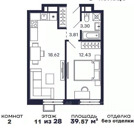 Продаётся 2-комнатная квартира 52, площадью 39,58 м², на 9 этаже в ЖК "Ильинойс" корпус 3. Стоимость — от 9707659 руб. Квартира без отделки, планировка односторонняя, окна на улицу.