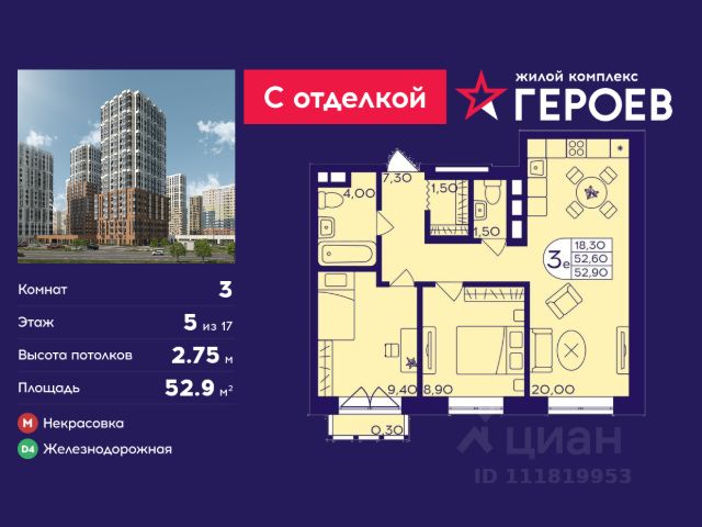 Продаётся 2-комнатная квартира 32.9 кв. м. в жилом комплексе "Героев" в Балашихе, Железнодорожный. Квартира расположена на 5 этаже 407 корпуса. Все квартиры представлены с чистовой отделкой. Вам не нужно тратить время и дополнительные финансы на ремонт или жить в шуме строительных работ - достаточно перевести свои вещи, расставить мебель и всё готово! Жилой квартал "Героев" - это уютный проект для семей с детьми. Всего 40 минут до центра Москвы. В квартале созданы все условия для досуга всех возрастов: игровые и спортивные площадки, места для отдыха и прогулок, магазины, кафе и пункты выдачи. За 15 минут можно дойти от дома до Ольгинского лесопарка - популярного места для прогулок и отдыха на свежем воздухе. Здесь приятно гулять всей семьёй, заниматься спортом или устроить пикник в выходной день. Преимущества: Квартира с готовой отделкой. Пространство полностью подготовлено для жизни: не нужно тратить время и деньги на ремонт или ждать его окончания. После получения ключей достаточно расставить мебель - и можно сразу заезжать и жить. Продуманные и светлые планировки. Просторные кухни-гостиные создают комфортное пространство для отдыха и встреч с близкими. В квартирах предусмотрены удобные гардеробные, благодаря чему легко поддерживать порядок и не перегружать комнаты шкафами. Увеличенное остекление. Большие окна наполняют квартиру естественным светом в течение всего дня, создавая ощущение простора и уюта, а также визуально расширяя пространство и делая интерьер более воздушным. Пешая доступность до станции Железнодорожная (МЦД-4) - дорога займёт не более 30 минут до центра Москвы: станции метро "Курская", "Площадь Ильича" или ТПУ Нижегородская.