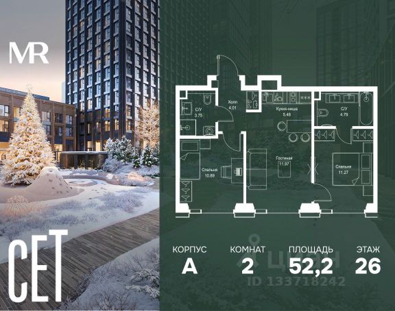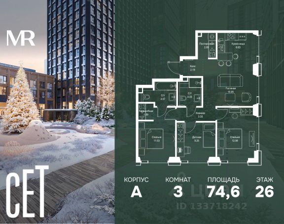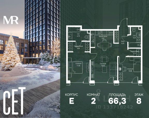 Прямая продажа от застройщика. В ЖК Сет продается 2-комнатная квартира площадью 66.32 м², расположенная в корпусе Е, на 8 этаже 8 этажного дома. Сет имеет стратегически выгодное расположение в ЗАО, в районе с большой историей и блестящим будущим: между природной зоной долины реки Сетунь и Кутузовским проспектом. В рамках возведения первой очереди предусмотрено три корпуса высотой 18, 45 и 59 этажей. На верхних этажах спроектированы общедоступные смотровые площадки с панорамным обзором на центр столицы. Преимущества проекта: • Функциональные планировочные решения • Контроль проникновения через входную дверь • Система управления освещением и температурой в квартире • Система защиты от протечек с функцией перекрытия воды • Вход в подъезд по биометрическим считывателям Face ID • Скоростные лифты • Двухуровневый подземный охраняемый паркинг на 495 машино-мест Застройка Сет включает в себя не только жилые корпуса, но и инфраструктурные объекты. Все необходимое для повседневного комфорта будет расположено в шаговой доступности: • Фитнес-клуб с бассейном • Ведущая городская школа, детский сад и школа искусств • Центр культуры и досуга • Медицинский центр • Кафе и рестораны Расположение комплекса: Пешком: • Метро "Давыдково" - 17 минут • Парк "Долина реки Сетунь" - 3 минуты • Открытие новых станций метро в шаговой доступности в будущем Инфраструктура: Разнообразить свой день резиденты Веер смогут также проводя больше времени на свежем воздухе. Двор разделен на 4 зоны разных эмоций и действий, которые пересечены и соединены веерными прогулочными маршрутами: • Спортивная площадка устроена в глубине ""Кленовой рощи"" • В ""Чайном домике"" будет создан навес с утеплением для отдыха в любую погоду • Площадки для детей воплотятся в ""Волшебный лес"" с цветами, зеркалами и световым дизайном • ""Центральная площадь"" устроена у водного оазиса живописного пруда. На машине: • "Москва-Сити" - 15 минут • Садовое кольцо - 20 минут • ТЦ "Океания" - 8 минут • ТЦ "Времена года" - 13 минут • Сколково - 12 минут • Гребной канал - 17 минут Компания MR предлагает своим клиентам специальные условия приобретения квартир в рамках программ ипотечного кредитования от банков-партнеров.