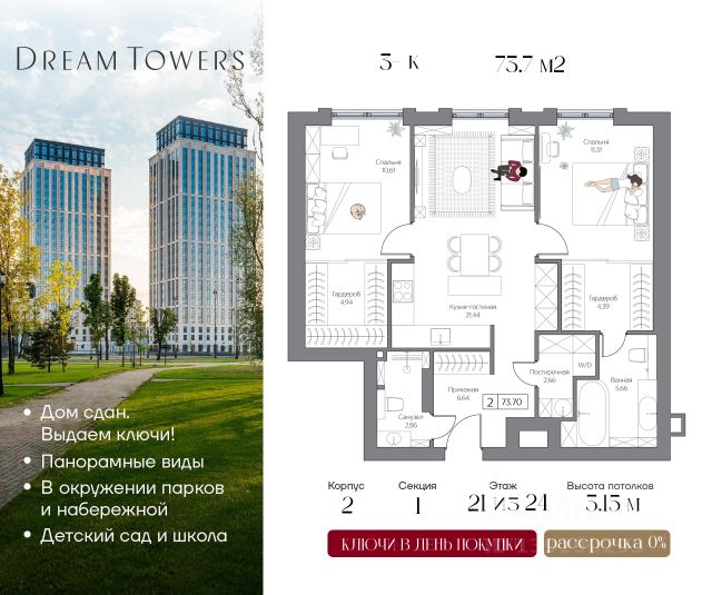 Рассрочка 0% от застройщика. Ключи в день покупки. ЖК Dream Towers — проект премиум-класса в окружении парков и набережной, с полностью готовой инфраструктурой для комфортной жизни и отдыха. Продаётся 3-квартира на 12 этаже 24-этажного дома (1 корпус). Общая площадь: 73.7 кв.м. Высота потолков от 3.15 м. Город-курорт на 100 Га в шаге от вашего дома: • пляжный комплекс Dream Beach Club; • парк аттракционов Остров Мечты; • 44 Га ландшафтных парков; • пешеходная набережная; • яхт-клуб; • Южный речной вокзал; • вейк-парк и многое другое. В Dream Towers предусмотрено все для комфортной жизни с семьей: • дизайнерские лобби с общественной гостиной, колясочной и лапомойками; • охраняемый благоустроенной двор только для жителей; • собственный десткий сад и школа прямо во дворе; • красивая архитектура зданий в стиле Ар-деко; • облицовка фасадов из натурального камня с архитектурной подсветкой; • широкоформатное остекление окон в пол для лучших видовых характеристик на парки и пойму Москвы-реки; • подземный паркинг; • клубный формат проживания; • эргономичные планировки от 40 до 162 м2; • высокие потолки от 3,15 до 4,1 м; • квартиры с террасами; • вся необходимая инфраструктура на первых этажах домов, а также в торговой частия тематического парка "Остров Мечты" (рестораны, кафе, супермаркет, магазины, салон красоты, йога-студия и многое другое). Центр рядом: 15 минут до Садового кольца на авто, 20 минут до Сити или Кремля. В 5 минутах прогулочным шагом — станция метро "Технопарк"