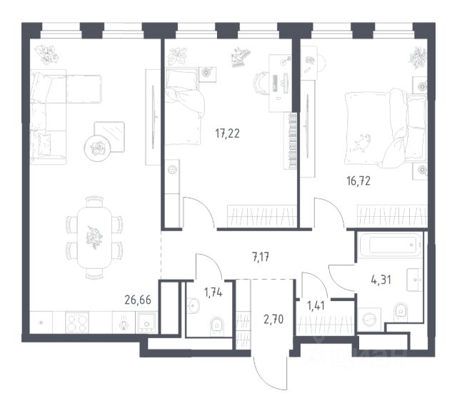 Проектная площадь с учетом лоджии составляет 66.18 м², жилая: комната 1-16,85 м², комната 2-15,98 м², лоджия- 3,90 м².