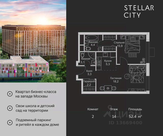 Продается квартира от надежного застройщика Tashir Estate в квартале бизнес-класса Stellar City в ЗАО Москвы. Площадь квартиры составляет: 46.7 кв. м, потолки: 2.9 м Квартира находится на 12 этаже, 4 корпуса жилого квартала Stellar City — микрогорода будущего на орбите Москвы. Stellar City — квартал в ЗАО Москвы вблизи инновационного центра Сколково. В окружении — 11 парков и природных зон, в том числе Долина реки Сетунь, Мещерский лес и парк развлечений The Rink. Город в городе Чтобы дом и инфраструктура вокруг отвечала динамичному лайфстайлу жителя мегаполиса, в основу проекта легла концепция город в городе, которая позволяет решать все бытовые вопросы in-home. В квартале будут возведены школа и детский сад, воркаут-зоны, променад, вело и беговые дорожки, детские площадки для каждого корпуса, а также коммерция на первых этажах для ежедневных покупок. Все необходимое — на расстоянии нескольких шагов. Изящные и лаконичные лобби Авторский дизайн, натуральные материалы в отделке и безупречный интерьер вне времени. Лобби и холлы в проекте бизнес-класса Stellar City ничем не отличаются от входных групп в премиум-сегменте благодаря качественным европейским материалам в отделке, стильному дизайну, консьерж-сервису и уютной зоне ожидания с журнальными столиками и мягкой мебелью. Комфорт и безопасность Закрытая территория, охрана, система СКУД, специально разработанное мобильное приложение дома для резидентов и подземный паркинг с круглосуточным наблюдением и доступом с помощью автоматического считывания номера авто.