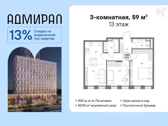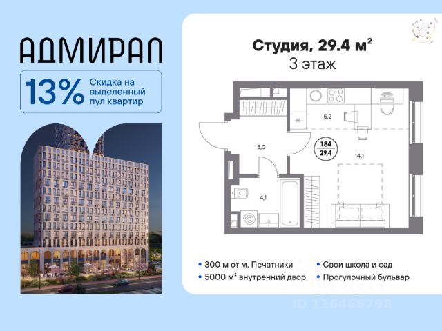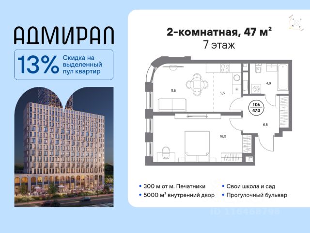 В динамично развивающемся районе Москвы, всего в 300 метрах от метро и в пешей близости от нового городского порта с протяженной набережной 13 км, свободной от автомобилей, продается 3-комнатная квартира площадью 73.70 м². без отделки. Квартира находится в корпусе жилого комплекса бизнес-класса "Адмирал", расположенного по адресу г. Москва, ул. Шоссейная, 4Д. (Застройщик - "Галс Девелопмент"). Новый амбициозный проект "Адмирал" станет частью одного из самых перспективных районов будущего - "Сити-2". В пешей доступности от современных башен Вас ждут живописные Люблинские пруды, 2 усадьбы с уникальной историей и уютный парк "Печатники" у Перервинского плёса. Район имеет отличную транспортную доступность: • 300 метров до станции метро "Печатники"; • Удобная пересадка на БКЛ и станцию МЦД-2; • 10 минут на машине до ТТК; • 15 минут до Садового кольца. Архитектура корпусов отличается динамичностью облика благодаря переменной этажности: высокие башни сочетаются с домами средней этажности. Изящным украшением становятся арочные витражи. Интеллигентный и современный стиль "Адмирала" продолжается в гранд-лобби: пастельные оттенки интерьера и фактурные элементы декора создают атмосферу безмятежного отдыха, особое ощущение простора дарят высокие потолки до 4 м и витражные окна. В домах предусмотрено от трех до шести скоростных лифтов, каждый из них спускается на любой этаж подземного паркинга и обладает удобными сенсорными панелями управления и низким уровнем шума. Благоустроенный двор площадью 5000 кв.м. украсят десятки видов гипоаллергенных растений. Здесь можно совершить приятный променад, по пути заглядывая за свежезаваренным кофе, уединиться за ноутбуком в комфортном коворкинге, занять ребенка играми в двухъярусном плейхабе или помедитировать на специальной площадке для йоги. Мягкий свет декоративных фонарей подчеркнет живописность местности, а чувство безопасности гарантируют круглосуточные системы видеонаблюдения. Дополнительные преимущества: • Высокие потолки от 2,9 до 3,25 м; • Бизнес-центр, школа и детский сад прямо на территории дома; • Подземный двухуровневый паркинг на 1955 машино-мест; • Кладовые помещения в тёплом контуре на 2м этаже; • Стрит-ритейл на первых этажах. Квартира в новостройке рядом с метро Текстильщики.