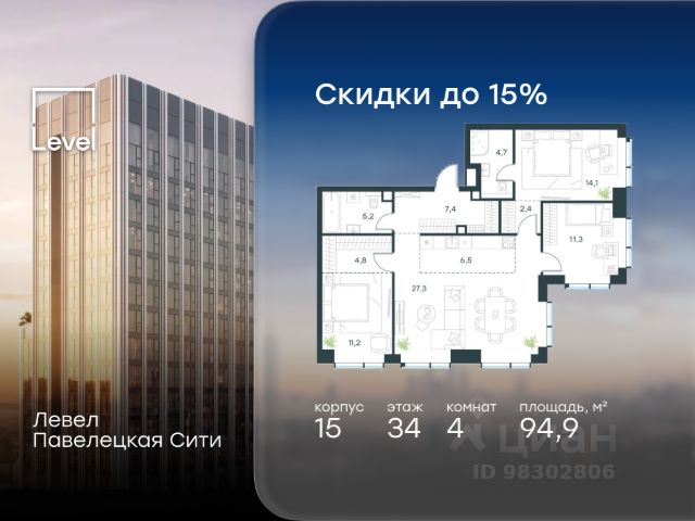 Цена указана с учётом скидки при 100%-й оплате, несубсидированной ипотеке, рассрочке (кроме программы "Рассрочка 0%"). В Даниловском районе столицы (ЮАО) продаётся 2-комнатная квартира площадью 47.20 кв.м c предчистовой отделкой. Квартира расположена на 8 этаже 45-этажного корпуса 15 в жилом комплексе бизнес-класса Левел Павелецкая Сити. Высота потолков 3.00м. Престижная локация Жилой комплекс бизнес-класса Левел Павелецкая Сити расположен в престижном Даниловском районе Москвы - историческом центре города в окружении парков, Москвы-реки и новейшей инфраструктуры. В 20 минутах пешком есть 3 станции метро, а в 5 минутах езды на авто - ТТК и Садовое кольцо. - 15 мин. пешком до метро "Павелецкая"; - 20 мин. пешком до станций "Тульская" и "Серпуховская"; - 8 мин. на авто до Кремля; - 10 мин. на авто до парка Горького и парка "Зарядье"; - 20 мин. на авто до башен "Москва-Сити". Авторская архитектура Авторская архитектура Авторская архитектурная концепция разработана бюро СПИЧ. Облик корпусов этапов 1 и 2 отсылает к стилистике архитектуры классического Нью-Йорка и золотой эпохи Голливуда. Корпуса этапа 4 вдохновлены эстетикой ар-деко. Умное линейное расположение корпусов гарантирует потрясающие виды на исторический центр и Москву-реку из большинства квартир. Дизайнерские лобби Изысканные интерьеры лобби жилого комплекса отсылают к классическим фильмам золотой эпохи Голливуда. Классика в жилом комплексе Левел Павелецкая Сити - не имитация, а современное осмысление лучшего в этом стиле. В каждом вестибюле оборудованы стойки ресепшен, комфортные зоны ожидания, гостевые санузлы, мойки для лап животных, колясочные. В корпусах по 3-4 лифта с прямым доступом в паркинг. Площадь лобби - от 47,9 до 114,9 кв. м, высота потолков - до 5,46 м. Благоустройство и инфраструктура Для создания благоустройства было приглашено 2 ведущих бюро - ADM и GAFA. Разноуровневое пространство вмещает в себя игровые площадки для детей всех возрастов, тропы здоровья для пеших прогулок, крытые аллеи с качелями, места для работы на свежем воздухе, многофункциональные спортивные площадки - зоны уличных тренировок, столы для пинг-понга, зоны командных игр. Общая площадь закрытого двора - 4,63 га. Комфорт - это когда рядом всё, что нужно для жизни. В жилом комплексе Левел Павелецкая Сити размещены 85 коммерческих помещений, где откроются супермаркеты, кафе, аптеки и многое другое. В составе проекта также предусмотрены собственный фитнес-клуб, развивающий центр Летово Кидс. Технологии и безопасность - Вайфай в лобби и на придомовой территории; - Автоматизированная система контроля и учета ресурсов; - Круглосуточное видеонаблюдение и охрана; - Круглосуточная связь с охраной через приложение, телефон или кол-центр; - Контроль доступа по биометрической системе распознавания лица; - Усиленный сотовый сигнал в лифтах и паркинге; - Распознавание номеров автомобилей при въезде/выезде в/из паркинга.