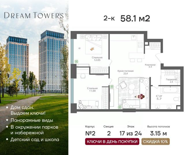 Увеличенный объем панорамного остекления создает неповторимое ощущения воздушности пространства! Двор-набережная с видами на гладь реки и кроны деревьев. Премиальный квартал DREAM RIVA — авторская архитектура в курортной концепции, воплощающей силу природных стихий в каждой детали оформления и благоустройства. Продаётся Квартира с 2 спальнями квартира на 4 этаже 26-этажного дома (3 корпус). Общая площадь: 63 кв.м. Высота потолков от 3 м. Формат приватного досуга и эксклюзивные привилегии в DREAM RIVA с приоритетным доступом для резидентов: - Первая линия Москвы-реки с открытыми видами на воду и город; - 3 Га приватного прибрежного парка с зонами для спорта и йоги; - Открытый солярий; - Школа и собственный детский сад; - Многофункциональные детские игровые площадки и детское кафе с игровой комнатой; - Клубная гостиная и lounge-бар. Локация вне конкуренции — инфраструктура полуострова предлагает всё, что нужно для размеренной жизни, работы, отдыха и развлечений: - Благоустроенная набережная с гастрогалереей; - Парк аттракционов Остров Мечты (в торговой части: рестораны, кафе, супермаркет, магазины, салон красоты, йога-студия и многое другое); - 44 Га ландшафтных парков для прогулок, спорта, пикников; - Пляжный комплекс Dream Beach Club со множеством бассейнов, ресторанов, баров и развлечений для любого возраста; - Яхт-клуб; - Вейк-парк; - Кинотеатр под открытым небом и многое другое. Удобная транспортная доступность: - Центр рядом: 15 минут до Садового кольца на авто, 20 минут до Сити или Кремля; - В 5 минутах прогулочным шагом — станция метро "Технопарк"; - Южный речной вокзал. Наши менеджеры будут рады провести для Вас консультацию и подробнее рассказать о проекте. Успейте купить на лучших условиях! Продается квартира в новостройке в районе Нагатинский затон в Москве.