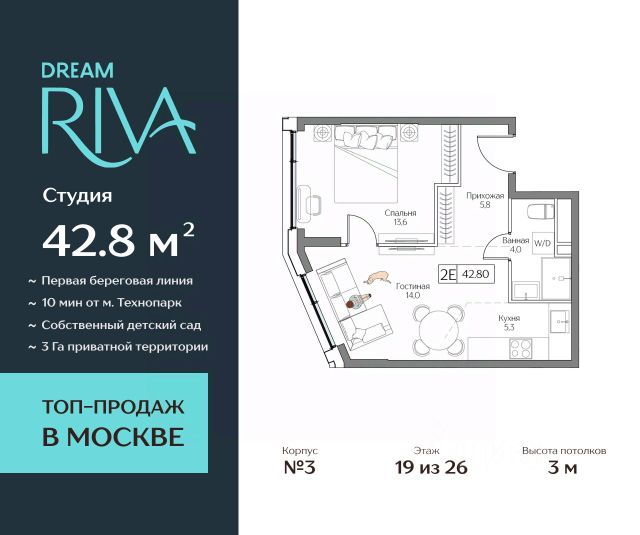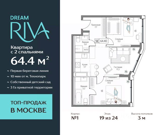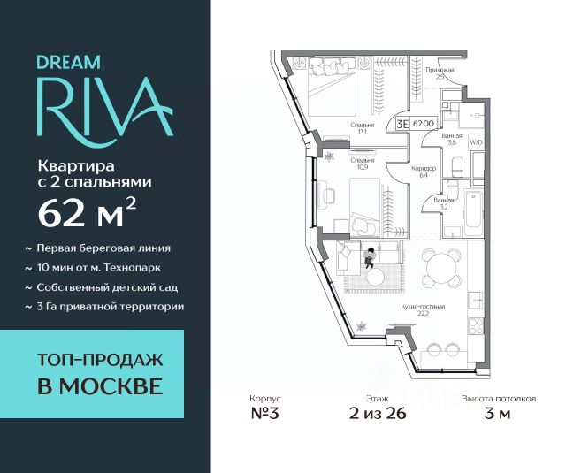 Рассрочка 0% от застройщика. Первоначальный взнос от 20%. Ключи в день покупки. ЖК Dream Towers проект премиум-класса в окружении парков и набережной, с полностью готовой инфраструктурой для комфортной жизни и отдыха. Продаётся 2-квартира на 6 этаже 6-этажного дома (3 корпус). Общая площадь: 57.1 кв.м. Высота потолков от 3.50 м. Город-курорт на 100 Га в шаге от вашего дома: - пляжный комлекс Dream Beach Club; - парк аттракционов Остров Мечты; - 44 Га ландшафтных парков; - пешеходная набережная; - яхт-клуб; - Южный речной вокзал; - вейк-парк и многое другое. В Dream Towers предусмотрено все для комфортной жизни с семьей: - дизайнерские лобби с общественной гостиной, колясочной и лапомойками; - охраняемый благоустроенной двор только для жителей; - собственный десткий сад и школа прямо во дворе; - красивая архитектура зданий в стиле Ар-деко; - облицовка фасадов из натурального камня с архитектурной подсветкой; - широкоформатное остекление окон в пол для лучших видовых характеристик на парки и пойму Москвы-реки; - подземный паркинг; - клубный формат проживания; - эргономичные планировки от 40 до 162 м2; - высокие потолки от 3,15 до 4,1 м; - квартиры с террасами; - вся необходимая инфраструктура на первых этажах домов, а также в торговой части тематического парка "Остров Мечты" (рестораны, кафе, супермаркет, магазины, салон красоты, йога-студия и многое другое). Центр рядом: 15 минут до Садового кольца на авто, 20 минут до Сити или Кремля. В 5 минутах прогулочным шагом — станция метро "Технопарк". Продается квартира в новостройке в районе Нагатинский затон в Москве.