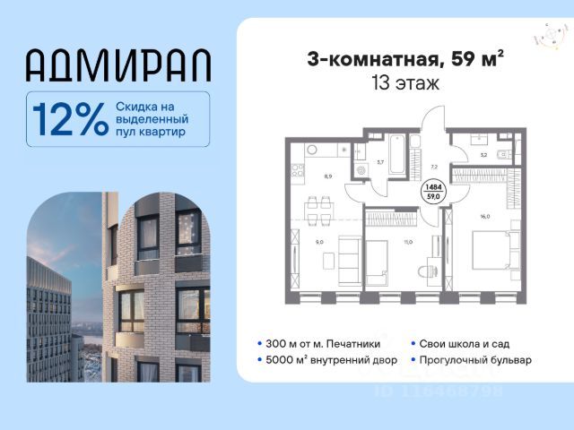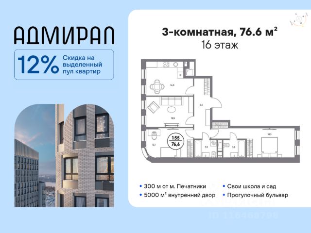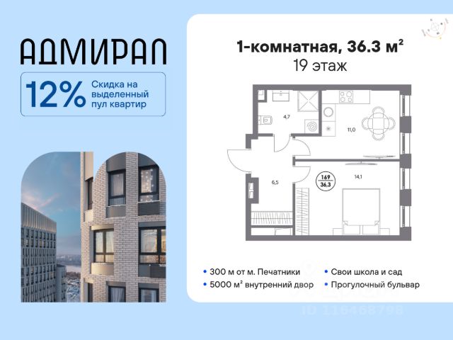 В динамично развивающемся районе Москвы, всего в 300 метрах от метро и в пешей близости от нового городского порта с протяженной набережной 13 км, свободной от автомобилей, продается 2-комнатная квартира площадью 49.40 м². без отделки. Квартира находится в корпусе жилого комплекса бизнес-класса "Адмирал", расположенного по адресу г. Москва, ул. Шоссейная, 4Д. (Застройщик - "Галс Девелопмент"). Новый амбициозный проект "Адмирал" станет частью одного из самых перспективных районов будущего - "Сити-2". В пешей доступности от современных башен Вас ждут живописные Люблинские пруды, 2 усадьбы с уникальной историей и уютный парк "Печатники" у Перервинского плёса. Район имеет отличную транспортную доступность: • 300 метров до станции метро "Печатники"; • Удобная пересадка на БКЛ и станцию МЦД-2; • 10 минут на машине до ТТК; • 15 минут до Садового кольца. Архитектура корпусов отличается динамичностью облика благодаря переменной этажности: высокие башни сочетаются с домами средней этажности. Изящным украшением становятся арочные витражи. Интеллигентный и современный стиль "Адмирала" продолжается в гранд-лобби: пастельные оттенки интерьера и фактурные элементы декора создают атмосферу безмятежного отдыха, особое ощущение простора дарят высокие потолки до 4 м и витражные окна. В домах предусмотрено от трех до шести скоростных лифтов, каждый из них спускается на любой этаж подземного паркинга и обладает удобными сенсорными панелями управления и низким уровнем шума. Благоустроенный двор площадью 5000 кв.м. украсят десятки видов гипоаллергенных растений. Здесь можно совершить приятный променад, по пути заглядывая за свежезаваренным кофе, уединиться за ноутбуком в комфортном коворкинге, занять ребенка играми в двухъярусном плейхабе или помедитировать на специальной площадке для йоги. Мягкий свет декоративных фонарей подчеркнет живописность местности, а чувство безопасности гарантируют круглосуточные системы видеонаблюдения. Дополнительные преимущества: • Высокие потолки от 2,9 до 3,25 м; • Бизнес-центр, школа и детский сад прямо на территории дома; • Подземный двухуровневый паркинг на 1955 машино-мест; • Кладовые помещения в тёплом контуре на 2м этаже; • Стрит-ритейл на первых этажах.
