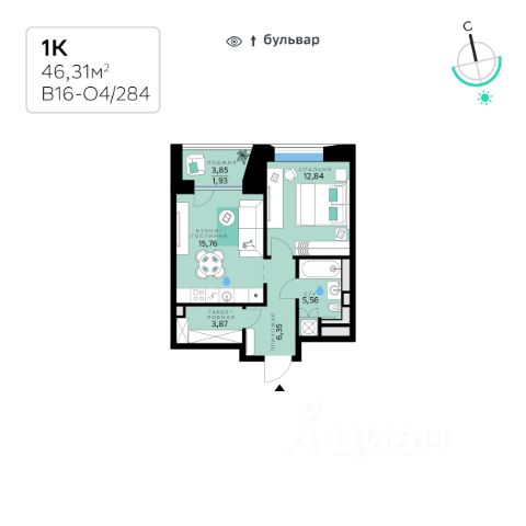 В продаже — однокомнатная квартира с чистовой отделкой, общей площадью 46,31 кв. м. Квартира расположена на четвертом этаже десятиэтажного корпуса Оптимум в квартале В16 нового района СберСити, который строит Сбер.