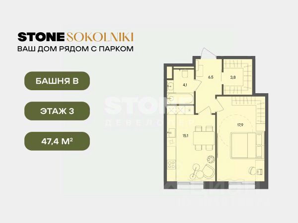 Старт продаж квартир в ЖК STONE SOKOLNIKI от девелопера STONE. В продаже функциональная и светлая односпальная квартира с кухней-гостиной и одной спальней для реализации любого дизайн-решения, идеально подходящая молодым парам и небольшим семьям. Современная архитектура проекта органично вписана в городскую среду. Концепция проекта разработана архитектурным бюро WALL Проект состоит из трех разновысотных башен высотой в 33, 28 и 24 этажа с чистой геометрией и увеличенной площадью остекления, которая позволит насладиться городской панорамой и видами на парк "Сокольники". Транспортная доступность - 10 мин. пешком до метро и БКЛ "Сокольники" и "Электрозаводская" - 12 мин. пешком до парка Сокольники - 10 мин. пешком до станции МЦД-3 "Митьково", которая позволит комфортно добираться в центр города и за его пределы Инфраструктура: В каждой входной группе предусмотрены помещения для временного хранения велосипедов, лапомойка, гостевой санузел, а также комната матери и ребенка. А колясочные появятся на каждом этаже - ведь это самое удобное решение для детей и их родителей. Планировочные решения: Планировки квартир в STONE Sokolniki создавались с учетом разнообразия современных сценариев жизни в городе. В проекте предусмотрены просторные кухни-гостиные, изолированные спальни с мастер-блоком, планировки для семей со взрослыми детьми, с двумя детьми разных возрастов. Благодаря грамотному зонированию квартир можно насладиться и временем с семьей, и уединением или, наоборот, устроить вечеринку вместе с друзьями. - Квартиры от 28 до 135 кв. м. Детский сад во дворе дома: Девелопер STONE осуществляет самостоятельный поиск оператора для детского сада, так как курирует наполнение проекта. На этапе финальной готовности будет выбран лучший оператор, отвечающий запросам качества и цены. Во всех своих проектах девелопер берет на себя ответственность за сдачу части помещений. Удобное хранение: В проекте STONE Sokolniki предусмотрена максимальная обеспеченность кладовыми. Хранения велосипедов в подземном паркинге возможно в зимний период, а летом будет организовано временное хранение на улице. Колясочные есть на каждом этаже всех трех жилых башен. - Колясочные на этаже - Кладовые для хранения Безопасная собственная территория дома, сим и паркинг: Внутри двора комфортно перемещаться пешком, все въезды в паркинг организованы по внешнему периметру. Велосипеды, самокаты и электросамокаты, детские беговелы и коляски - в приоритете, для всех колесных видов транспорта продуманы удобные маршруты движения и варианты хранения в разные сезоны. STONE - девелопер коммерческой и жилой недвижимости классов бизнес и премиум в Москве с 18-летним опытом. С 2022 года занимает лидирующую позицию на офисном рынке (рейтинг РБК). Сегодня в портфеле девелопера представлено 2,5 млн кв. м построенных, строящихся и проектируемых объектов, из которых более 850 тыс. кв. м находятся в стадии строительства. Компания имеет самый масштабный проектный портфель офисной недвижимости клас Квартира в новостройке в районе Сокольники в Москве.