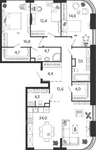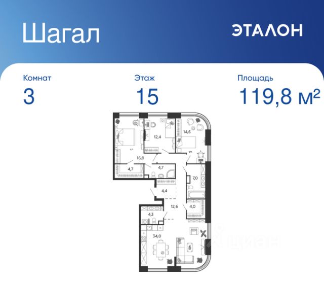Продается 3-к квартира без отделки в ЖК "Шагал". Общая площадь квартиры — 119.8 кв. м, этаж 15 из 16. Тип дома — монолитный. Цена указана при 100% оплате. Квартал Шагал — крупнейший проект комплексного освоения в Москве. В проекте реализуется продуманная система маршрутов. Еда, покупки, услуги, прогулки, спорт, образование, работа и развлечения — все будет находиться рядом с домом: принцип 15-минутной доступности инфраструктуры и сервисов. Разнообразие и продуманность пешеходных маршрутов, а также короткие расстояния между основными точками притяжения мотивируют резидентов Шагал с удовольствием передвигаться по району пешком, не выпадая из ритма большого города. Продуманная транспортная сеть района и безопасный скоростной режим создают комфортные условия для перемещений любым способом: на автобусе, машине, самокате или велосипеде. Не нужно выезжать из района, чтобы получить комфорт и сервис самого высокого современного стандарта: все необходимые услуги, инфраструктура, парки и вторая по протяженности набережная в городе — на расстоянии 15-минутной прогулки от вашего дома. Квартал Шагал станет первым в Москве жилым районом, где будут комплексно реализованы инновационные подходы в проектировании и строительстве зданий. Архитектурная композиция состоит из домов отличающегося типа. Высотные башни-доминанты с видовыми квартирами, дома пониже, растворяющиеся в спокойствии внутренних двориков, малоэтажные камерные таунхаусы и разноэтажные дома с лоджиями на первой береговой линии соединяются в одно эстетичное современное произведение. В результате создаётся насыщенное идентичное пространство, подчёркнутое плавностью природных форм, наполненное светом, воздухом и свободой. Квартира в новостройке на улице Ильи Чашника в Москве.