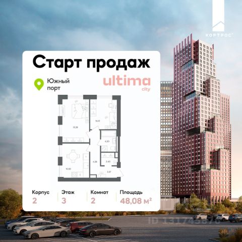 Указанная акционная стоимость доступна при 100% оплате или ипотеке без субсидирования. Цена действует до 31.12.2025 23:59:00. Стоимость без акции 22116800. Старт продаж! Продаётся 2-комнатная квартира от застройщика ГК "КОРТРОС" в жилом комплексе бизнес-класса ULTIMAcity. Квартира расположена на 3 этаже 52 этажного корпуса 2. Общая площадь 48,08 м². Без отделки. В квартире: • Окна на две стороны света • Гардеробная • Два сан. узла ULTIMAcity — жилой комплекс бизнес-класса в перспективном районе на юго-востоке Москвы. На его территории появятся 9 башен на 756 этажей, двухуровневый подземный паркинг, собственная инфраструктура, включая детский сад и школу. Всего девелопер благоустроит территорию в 2,6 га. Ближайшая станция метро — "Южный порт". Она откроется в 2028 году и будет находиться в 2-х минутах ходьбы. А прямо напротив расположится остановка водного автобуса-электрохода "Синичка". Дорога от квартала будет удобна и для автомобилистов: - до Кремля — 12 км - до МКАД — 12 км - до выезда на ТТК — 3 км - до Садового кольца — 8 км В двух корпусах первой очереди ULTIMAcity этажностью 45 и 52 реализуется 1 079 квартир с продуманными, рациональными планировочными решениями. В ассортиментной линейке представлены однокомнатные квартиры от 28,2 до 61 кв. м, двухкомнатные лоты от 44,3 до 95,4 кв. м, квартиры с тремя (71 — 115,57 кв. м) и четырьмя спальнями (106,6 — 114,97 кв. м). В экспозиции также есть квартиры с террасами, лоджиями, тремя и четырьмя санузлами, а также с функциональными нишами-кладовыми на кухнях. Запроектированы и эксклюзивные двухуровневые резиденции со вторым светом, в том числе с видом на Москву-реку, площадью от 77,7 до 141,9 кв. м. В рамках проекта запланировано строительство 9 корпусов, школы на 500 учащихся и детского сада на 225 мест. Еще будет создана продуманная инфраструктура для жителей: детские и спортивные площадки, амфитеатр для мероприятий, беседки и теплицы для садоводства, коворкинг, детский клуб и ресторан с открытой террасой. Доступ в жилой комплекс осуществляется по биометрическому контролю - Face ID. Вокруг квартала будет приватная территория с видеонаблюдением и консьерж-сервисом 24/7. Лобби корпусов будут иметь двойные выходы: на улицу и во внутренний закрытый двор. Продам квартиру в новостройке в округе ЮВАО в Москве.