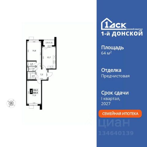 Прямая продажа от застройщика! Жилой Комплекс класса Комфорт Плюс. Продаётся 2-к квартира номер 681 общей площадью 64.4 кв.м. на 23-м этаже 24 этажного здания. Предчистовая отделка. Особенности квартиры: - МЦД-5 в пешей доступности - Квартал с собственной набережной - Свои 2 детских сада и школа - Просторная спальня, в которой можно разместить большую кровать. - Распашная планировка - отличное сочетание удобства и свободы. - Раздельный санузел - больше удобства для всех членов семьи. - Просторная кухня - место для семейных ужинов и кулинарных экспериментов. - Гардеробная - удобство для хранения и организации вещей. - Лоджия - уютное место для отдыха и тишины. Квартира с предчистовой отделкой (White box). Вам не придется заниматься черновыми и трудоёмкими работы, а чистовую отделку и дизайн - сделайте на свой вкус. Информация о комплексе: Комплекс 1-й Донской расположен в 7 км от МКАД по трассе М-4 Дон. В нем сочетаются все плюсы комфортной городской среды и природного окружения. В проекте достаточно большой процент квартир, выходящих на 2-3 стороны света. Секции-маяки формируют у зданий визуальную L-форму, что придает застройке структуру и ритмику объемов. На ощущение динамики работает и разная этажность зданий. Теплая цветовая палитра фасадов отражает природу Дона. Вечерами дома преображаются благодаря архитектурной подсветке, выгодно выделяясь на городском фоне. Природа оказывает положительное влияние на человека на всех уровнях восприятия: через зрение, запахи, звуки, тактильные ощущения. Неподалеку от ЖК Первый Донской: Ермолинский парк, Видновский лесопарк, Жуковский парк Транспортная доступность: Комплекс удобно расположен в 7 км от МКАД по трассе М-4 Дон (через Видное). Расстояние до Каширского шоссе составляет 12 км. Добраться до метро и центра Москвы позволяет развитая сеть маршрутов общественного наземного транспорта. Действующая ж/д станция Калинина Павелецкого направления в 15-17 минутах ходьбы (МЦД-5 в 2025-2026 гг). Внутренняя инфраструктура: Проект 1-й Донской соседствует с бурно развивающимся районом, основная инфраструктура которого уже сложилась. В строительстве современных жилых комплексов в округе есть свои плюсы: здесь формируется продуманная и комфортная городская среда. Что касается внутренней инфраструктуры, на территории квартала будут расположены собственные муниципальные 2 детских садика и школа, которые помогут совместить приятное с полезным. Территория комплекса пронизана целой сетью живописных пешеходных маршрутов, позволяющих попасть в любой уголок района. Основные пути, как водится, "торговые". Они проходят вдоль магазинов, кафе и других представителей коммерции и отделяются от проезжей части зеленой "фито" - стеной. Среди крупных социальных объектов предусмотрены своя поликлиника и торговый центр с примыкающей площадью для общественных мероприятий. Уют начинается с продуманного подъезда. Сквозные подъезды наполнены светом благодаря сплошному остеклению. Вход в них есть и