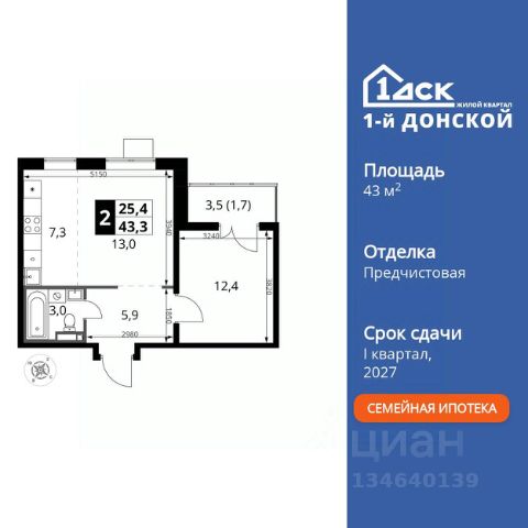 Прямая продажа от застройщика! Жилой Комплекс класса Комфорт Плюс. Продаётся 2-к квартира номер 469 общей площадью 43.3 кв.м. на 23-м этаже 24 этажного здания. Предчистовая отделка. Особенности квартиры: - МЦД-5 в пешей доступности - Квартал с собственной набережной - Свои 2 детских сада и школа - Линейная планировка - максимальная функциональность и удобство. - Евроформат - просторное и удобное жилье с отличной планировкой. - Кухня-гостиная - идеальное пространство для встреч с близкими. - Линейная кухня - функциональность и практичность в одном решении. - Лоджия - уютное место для отдыха и тишины. Квартира с предчистовой отделкой (White box). Вам не придется заниматься черновыми и трудоёмкими работы, а чистовую отделку и дизайн - сделайте на свой вкус. Информация о комплексе: Комплекс 1-й Донской расположен в 7 км от МКАД по трассе М-4 Дон. В нем сочетаются все плюсы комфортной городской среды и природного окружения. В проекте достаточно большой процент квартир, выходящих на 2-3 стороны света. Секции-маяки формируют у зданий визуальную L-форму, что придает застройке структуру и ритмику объемов. На ощущение динамики работает и разная этажность зданий. Теплая цветовая палитра фасадов отражает природу Дона. Вечерами дома преображаются благодаря архитектурной подсветке, выгодно выделяясь на городском фоне. Природа оказывает положительное влияние на человека на всех уровнях восприятия: через зрение, запахи, звуки, тактильные ощущения. Неподалеку от ЖК Первый Донской: Ермолинский парк, Видновский лесопарк, Жуковский парк Транспортная доступность: Комплекс удобно расположен в 7 км от МКАД по трассе М-4 Дон (через Видное). Расстояние до Каширского шоссе составляет 12 км. Добраться до метро и центра Москвы позволяет развитая сеть маршрутов общественного наземного транспорта. Действующая ж/д станция Калинина Павелецкого направления в 15-17 минутах ходьбы (МЦД-5 в 2025-2026 гг). Внутренняя инфраструктура: Проект 1-й Донской соседствует с бурно развивающимся районом, основная инфраструктура которого уже сложилась. В строительстве современных жилых комплексов в округе есть свои плюсы: здесь формируется продуманная и комфортная городская среда. Что касается внутренней инфраструктуры, на территории квартала будут расположены собственные муниципальные 2 детских садика и школа, которые помогут совместить приятное с полезным. Территория комплекса пронизана целой сетью живописных пешеходных маршрутов, позволяющих попасть в любой уголок района. Основные пути, как водится, "торговые". Они проходят вдоль магазинов, кафе и других представителей коммерции и отделяются от проезжей части зеленой "фито" - стеной. Среди крупных социальных объектов предусмотрены своя поликлиника и торговый центр с примыкающей площадью для общественных мероприятий. Уют начинается с продуманного подъезда. Сквозные подъезды наполнены светом благодаря сплошному остеклению. Вход в них есть и с улицы, и со двора.