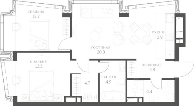 В премиальном квартале "Матч Поинт" представлены апартаменты-студия 34,9 м² на 9 этаже. Светлое пространство с продуманной планировкой. Вариант планировочного решения: Площадь 23,9 м² — зона кухни-гостиной и спальни. Прихожая 5,9 м² — удобная зона хранения. О жилом квартале "Матч Поинт" Расположение, доступность, инфраструктура. Жилой квартал расположен в престижном районе Москвы — рядом с Кутузовским проспектом, Триумфальной аркой и станциями метро "Парк Победы", "Филевский парк", "Багратионовская" и "Минская". Парк Победы, Поклонная гора и Филевский парк создают прекрасные условия для отдыха. Вблизи расположены МГУ и МГИМО. Из окон комплекса открываются виды на Парк Победы, панораму Кутузовского проспекта, "Москва-Сити". В квартале работает полноценная инфраструктура: более 10 салонов красоты, аптека, химчистка, ателье, зоосалон, цветочный магазин, фотостудия. Есть кафе и рестораны, спортивные площадки, фитнес-клубы, детские центры и билингвальный детский сад. Трехуровневый подземный паркинг рассчитан на 1600 мест. Территория оборудована системой видеонаблюдения и современными системами безопасности.