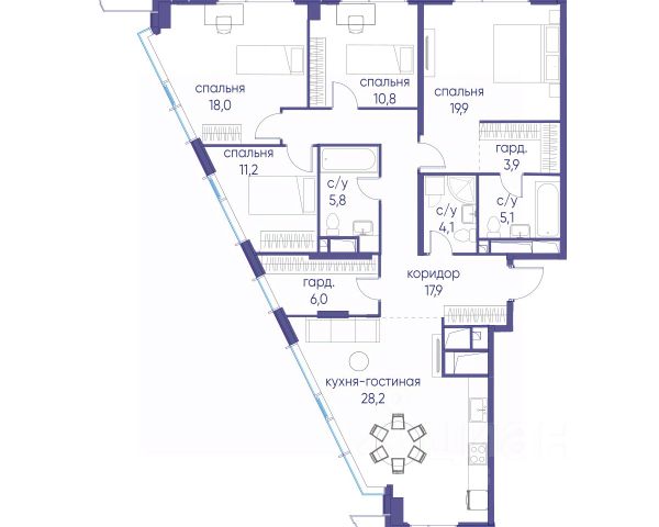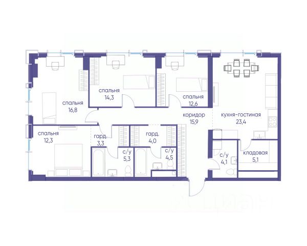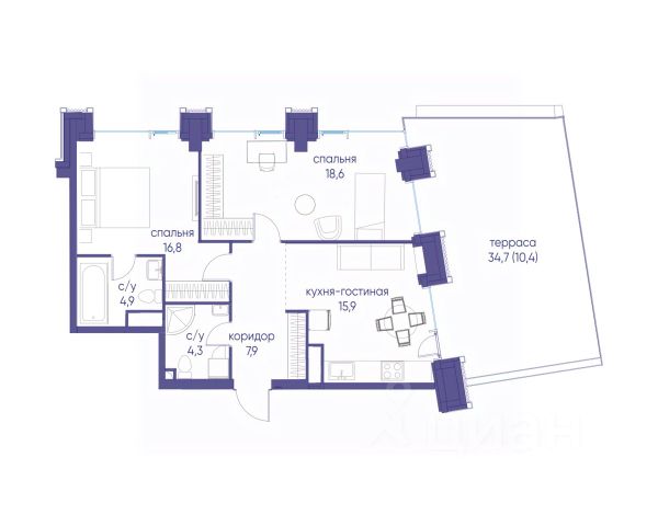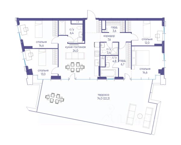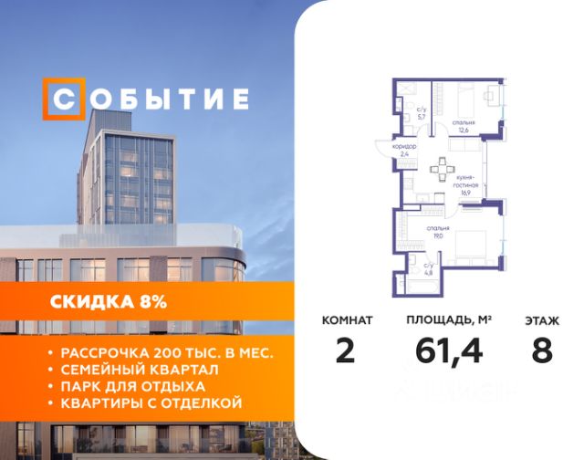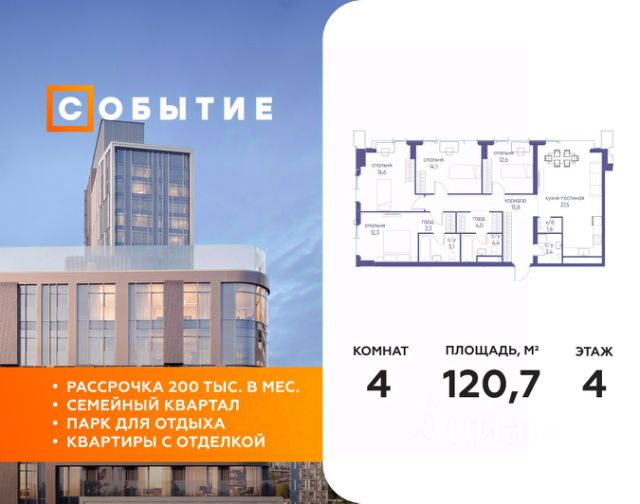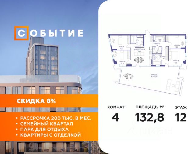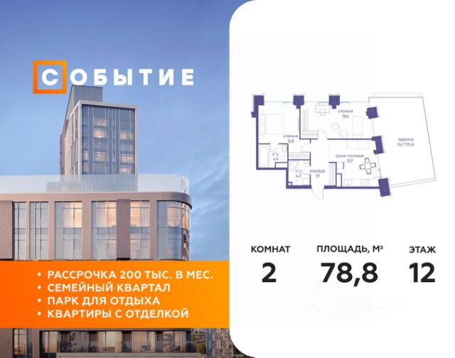 В продаже 3-к квартира от застройщика. Общая площадь 75.40, жилая 36.60, кухня 21.1. Квартира расположена на 7 этаже жилого квартала "Событие-6", корпус 2, 3. Квартира без отделки. Срок сдачи: 4 кв. 2029 года. СОБЫТИЕ.6 — финальный дом парк-квартала СОБЫТИЕ на Мосфильмовской. Переезжайте в уже сформированный квартал с готовой инфраструктурой и парком! Премиальный жилой комплекс в престижном районе Москвы предлагает стильную архитектуру, продуманное благоустройство и великолепно разнообразие общественных пространств. Свой парк прямо возле дома! Архитектура Архитектура СОБЫТИЯ.6 выполнена в ультрасовременном стиле московским бюро Atrium на основе дизайн-кода британских архитекторов LDA Design и UHA London. Дом отличает оригинальная геометрия фасадов, большое остекление и высокие лобби (до 6,2 м) с авторской мебелью и светильниками. Расположение Мосфильмовская улица (Раменки) — один из престижных районов Москвы. Близость к историческому и деловому центру, природным зонам Запада столицы. Транспортная доступность: • 10 мин до Москва-Сити и ТТК; • 15 мин до Садового кольца; • 25 мин до аэропорта Внуково; • 7-10 мин до станций метро "Аминьевская" и "Мичуринский проспект". Инфраструктура: • парк "Событие" (12 га, финалист конкурса Правительства Москвы) с беговыми (1,5 км) и велодорожками (2,7 км), экотропой (1,6 км), площадками, лекторием; • школа, детский сад, магазины, салоны красоты, рестораны (к моменту заселения); • мультидвор с игровыми и спортивными площадками, мини-бульваром; • общественная терраса на 10-м этаже (коворкинг, лаунж); • Закрытые общественные пространства: детская комната, спортивный зал, коворкинг, лаунж-зоны. Паркинг 256 мест для жителей (48 — для электромобилей), 24 гостевых (5 — для электромобилей), мойки колес, кладовые, зоны для велосипедов. Окружение Парки и заповедники (Воробьёвы горы, Матвеевский лес и др.), МГУ, театр им. Н. И. Сац, стадион "Лужники". Безопасность Видеонаблюдение, контроль доступа, видеодомофоны, консьерж-сервис 24/7, системы пожарной безопасности и мультисервисная оптическая сеть.