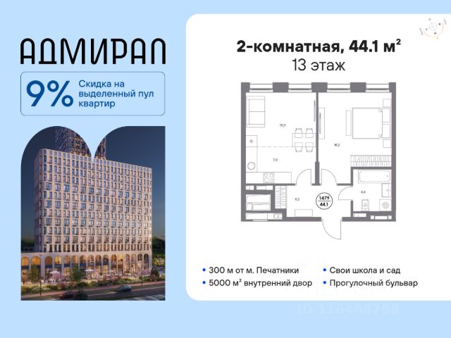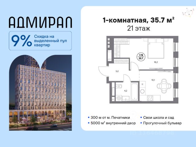 В динамично развивающемся районе Москвы, всего в 300 метрах от метро и в пешей близости от нового городского порта с протяженной набережной 13 км, свободной от автомобилей, продается 1-комнатная квартира площадью 35.40 м². без отделки. Квартира находится в корпусе жилого комплекса бизнес-класса "Адмирал", расположенного по адресу г. Москва, ул. Шоссейная, 4Д. (Застройщик - "Галс Девелопмент"). Новый амбициозный проект "Адмирал" станет частью одного из самых перспективных районов будущего - "Сити-2". В пешей доступности от современных башен Вас ждут живописные Люблинские пруды, 2 усадьбы с уникальной историей и уютный парк "Печатники" у Перервинского плёса. Район имеет отличную транспортную доступность: • 300 метров до станции метро "Печатники"; • Удобная пересадка на БКЛ и станцию МЦД-2; • 10 минут на машине до ТТК; • 15 минут до Садового кольца. Архитектура корпусов отличается динамичностью облика благодаря переменной этажности: высокие башни сочетаются с домами средней этажности. Изящным украшением становятся арочные витражи. Интеллигентный и современный стиль "Адмирала" продолжается в гранд-лобби: пастельные оттенки интерьера и фактурные элементы декора создают атмосферу безмятежного отдыха, особое ощущение простора дарят высокие потолки до 4 м и витражные окна. В домах предусмотрено от трех до шести скоростных лифтов, каждый из них спускается на любой этаж подземного паркинга и обладает удобными сенсорными панелями управления и низким уровнем шума. Благоустроенный двор площадью 5000 кв.м. украсят десятки видов гипоаллергенных растений. Здесь можно совершить приятный променад, по пути заглядывая за свежезаваренным кофе, уединиться за ноутбуком в комфортном коворкинге, занять ребенка играми в двухъярусном плейхабе или помедитировать на специальной площадке для йоги. Мягкий свет декоративных фонарей подчеркнет живописность местности, а чувство безопасности гарантируют круглосуточные системы видеонаблюдения. Дополнительные преимущества: • Высокие потолки от 2,9 до 3,25 м; • Бизнес-центр, школа и детский сад прямо на территории дома; • Подземный двухуровневый паркинг на 1955 машино-мест; • Кладовые помещения в тёплом контуре на 2м этаже; • Стрит-ритейл на первых этажах.