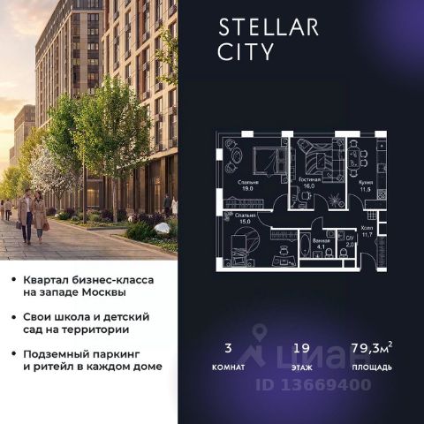 Продается квартира от надежного застройщика Tashir Estate в квартале бизнес-класса Stellar City в ЗАО Москвы. Площадь квартиры составляет: 71.7 кв. м, потолки: 3.1 м Квартира находится на 1 этаже, 4 корпуса жилого квартала Stellar City — микрогорода будущего на орбите Москвы. Stellar City — квартал в ЗАО Москвы вблизи инновационного центра Сколково. В окружении — 11 парков и природных зон, в том числе Долина реки Сетунь, Мещерский лес и парк развлечений The Rink. Город в городе Чтобы дом и инфраструктура вокруг отвечала динамичному лайфстайлу жителя мегаполиса, в основу проекта легла концепция город в городе, которая позволяет решать все бытовые вопросы in-home. В квартале будут возведены школа и детский сад, воркаут-зоны, променад, вело и беговые дорожки, детские площадки для каждого корпуса, а также коммерция на первых этажах для ежедневных покупок. Все необходимое — на расстоянии нескольких шагов. Изящные и лаконичные лобби Авторский дизайн, натуральные материалы в отделке и безупречный интерьер вне времени. Лобби и холлы в проекте бизнес-класса Stellar City ничем не отличаются от входных групп в премиум-сегменте благодаря качественным европейским материалам в отделке, стильному дизайну, консьерж-сервису и уютной зоне ожидания с журнальными столиками и мягкой мебелью. Комфорт и безопасность Закрытая территория, охрана, система СКУД, специально разработанное мобильное приложение дома для резидентов и подземный паркинг с круглосуточным наблюдением и доступом с помощью автоматического считывания номера авто.