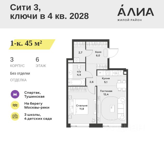 Продаётся 2-комнатная квартира 72.8 м². В жилом районе Алиа на 16-м этаже 28-этажного дома. Жилой район Алиа — это дома бизнес-класса у слияния Москвы-реки и Сходни. Алиа находится в Покровском-Стрешневе, экологически чистом районе на престижном северо-западе столицы. Район возводится на бывшей территории Тушинского аэрополя, где никогда не было промышленного производства. Алиа — это район разностороннего развития, спроектированный по принципу WORK.LIVE.PLAY.LEARN. Это "15-минутный город", где вся необходимая для комфортной жизни инфраструктура — на расстоянии приятной прогулки. У района удобное расположение: отсюда меньше 10 минут пешком до станций метро "Спартак" и "Тушинская" и всего полчаса на автомобиле до центра города или аэропорта Шереметьево. Архитектурную концепцию Алиа разработало бюро SOM (Skidmore, Owings & Merrill), авторы знаменитой "Бурдж-Халифа". В Алиа больше 140 планировочных решений, среди которых — редкие для Москвы форматы: квартиры с окном в ванной, пентхаус, сити-юниты и таунхаусы. Почти половина территории района отдана под благоустройство. В Алиа три парка: Линейный парк с кафе и магазинами, Центральный парк с амфитеатром, сухим фонтаном и большим плейхабом для детей всех возрастов и Прибрежный парк на собственной набережной, одной из самых длинных в Москве. В каждом урбан-блоке — закрытый внутренний двор с гипоаллергенными растениями и детской площадкой. В лобби каждого жилого корпуса в Алиа оборудована зона ожидания, колясочная, гостевой санузел и лапомойка для домашних животных. За стойкой ресепшена резидентов и их гостей встречает консьерж. Центральное лобби урбан-блока — это стильное общественное пространство с коворкингом, лаундж-зоной и кофе-пойнтом. Это "вторая гостиная" жителей урбан-блока и одно из мест, где формируется комьюнити Алиа. Два ключевых объекта инфраструктуры в Алиа — это спорткомплекс "Чкалов Арена", где представлены 25 видов спорта, и самый большой в стране бизнес-парк класса A, благодаря которому району обеспечено быстрое развитие.