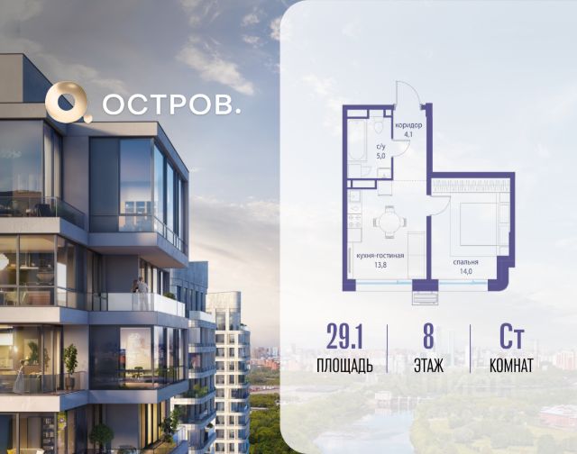 Продаётся квартира от застройщика: общая площадь 29.60 м², жилая м², кухня м², 2-й этаж, жилой квартал "Остров 14", корпус 6 (секция 1). Срок сдачи: 2 квартал 2029 года. . В жилой зоне 2 больших окна на одну сторону, хорошая инсоляция. Позвоните сейчас и забронируйте квартиру! ОСТРОВ от Донстрой - жилой комплекс на западе Москвы, в Мневниковской пойме. Уникальное преимущество комплекса - в том, что он обособлен от города рекой и природным парком (650 га). Благодаря природному окружению эта территория имеет лучший экологический рейтинг в столице. Кварталы ОСТРОВА объединены ландшафтным дизайном в единое пространство - с набережными и Центральным бульваром. На ОСТРОВЕ любые объекты, необходимые для полноценной жизни и отдыха, находятся на расстоянии 15-минутной прогулки. Торговый центр и супермаркеты, кафе и рестораны, фитнес, салоны красоты, школы и детские сады. А также крупнейший в Москве спортивный кластер.