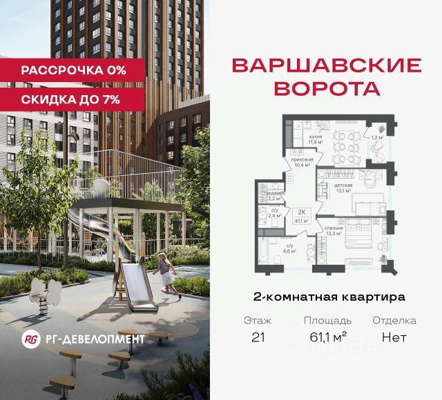 Рассрочка 0% + скидка 5%. Первый платёж 50% при ДДУ, второй 50% — через 12 мес. до ввода ЖК. Продаются 2-комнатные апартаменты 56,9 кв.м. в МФК "Варшавские ворота" на 6-м этаже 9 этажного дома. МФК "Варшавские ворота" — это проект, в котором учтен широкий спектр требований: от транспортной доступности и развитой инфраструктуры до архитектурной выразительности и экологического окружения. Апартаменты в МФК "Варшавские ворота" подойдут для тех, кто ищет продуманное жилье в Москве или готовый инвестиционный актив. Апартаменты здесь — это: - возможность жить комфортно в удобном городском формате — с природой, метро, сервисом и паркингом; - возможность купить лот с готовой отделкой, чтобы вложить минимальные инвестиции в ремонт и получить максимум возможностей от сдачи; - экономия на налоге на имущество, кадастровая стоимость апартаментов ниже ~ на 30% кадастровой стоимости квартиры; - высокая инвестиционная доходность объекта за счет более низкой цены покупки по сравнению с квартирой. Коротко о важном: - 1 минута пешком от м. Аннино; - Удобные выезды на Варшавское шоссе и МКАД; - Вид из окон на Битцевский лес и Аннинский лесопарк; - Высота потолков 2,7 - 3 м; - Закрытый двор-парк; - Школы и детские сады в 10-15 минутах пешком от дома; - Технические лоджии для размещения кондиционеров; - Подземный паркинг; - РГ-Девелопмент — ТОП-20 крупнейших застройщиков России. Проект сочетает в себе современную архитектуру и продуманное благоустройство с уникальным природным окружением. Всего в нескольких минутах от дома — девять парков, каскад прудов и крупнейшие лесопарковые зоны Москвы, создающие ощущение жизни в зеленом оазисе посреди мегаполиса. Архитектурная концепция - стиль Чикаго в Москве. Выполнена в минималистичной эстетике с использованием клинкера и декоративного кирпича. Фасады подчеркивают строгие линии и современный стиль, а входные группы разработаны московским бюро Syntaxis. Лобби оформлены с применением керамогранита, декоративной штукатурки и гипсовых панелей, детали из латуни добавляют изысканности. Пространство оживляют гербарии, композиции из сухоцветов и авторские панно. Проект находится в одной минуте пешком от метро "Аннино", в 12 минутах от станции "Улица Академика Янгеля" и рядом с МЦД-2 "Красный Строитель". Для автомобилистов предусмотрен прямой выезд на Варшавское шоссе и два съезда на МКАД, что позволяет быстро добираться в любую часть города. Среди планировочных решений представлены разнообразные форматы: от функциональных студий до просторных 4-комнатных квартир и апартаментов площадью от 22 до 105 м². Высокие потолки усиливают ощущение простора, а продуманные планировки включают мастер-спальни, гардеробные, угловые окна, объединённые кухни-гостиные и несколько санузлов. Центральное пространство комплекса — закрытый двор без машин. Он разделён на функциональные зоны: детские игровые комплексы, спортивные площадки, воркаут-зоны и уютные места для тихого отдыха. На первых этажах разместя Продам квартиру с отделкой от застройщика рядом с метро Улица Академика Янгеля.