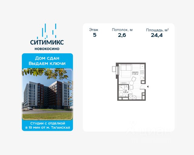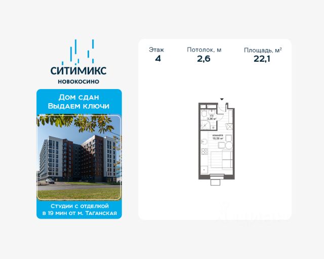 Продаётся уютная студия-апартаменты в 9-ти этажном комплексе, общей площадью 22,1 кв.м., на 4 этаже. Апартаменты с чистовой отделкой "под ключ" и большими окнами. В некоторых лотах предусмотрен Эркер много света и очень красиво. Архитектурный облик комплекса выполнен в современном стиле, на огороженной территории благоустройство, зоны отдыха и детские площадки. На первых этажах вы найдете кофейни и рестораны, продуктовые магазины, центры бытовых услуг, аптеки и другие объекты необходимого сервиса. А современные лобби с витражным остеклением и дизайнерской отделкой порадуют жителей дневным светом и воздухом. Менее чем за 1 минуту пешком можно добраться до таких объектов, как: Ледовый дворец, Спортивный комплекс Косино и Клуб водных видов спорта Acquatica. Рядом с комплексом расположены: детские сады, множество школ, стоматология, центр развития ребенка, магазины, кафе и отделения банков. Район отличается хорошей экологией: озера Черное и Белое, а также Салтыковский лесопарк площадью 1012 га. Рядом с озёрами находится Косинский пляж с широкой чистой прибрежной полосой, песчаным берегом и зоной для игр в волейбол. МФК "СИТИМИКС Новокосино" находится в 15 минутах пешком от м. Новокосино, время поездки до центра Москвы займёт всего 30 минут. Дом сдан. Выдаём ключи. Застройщиком квартала выступает компания APSIS GLOBE, основанная в 2008 году. В качестве девелопера компания успешно завершила ряд инфраструктурных, коммерческих объектов на территории Московской области, Москвы, Санкт-Петербурга. В портфолио застройщика школа, детский сад, жилые и многофункциональные комплексы, комплексная застройка микрорайонов.