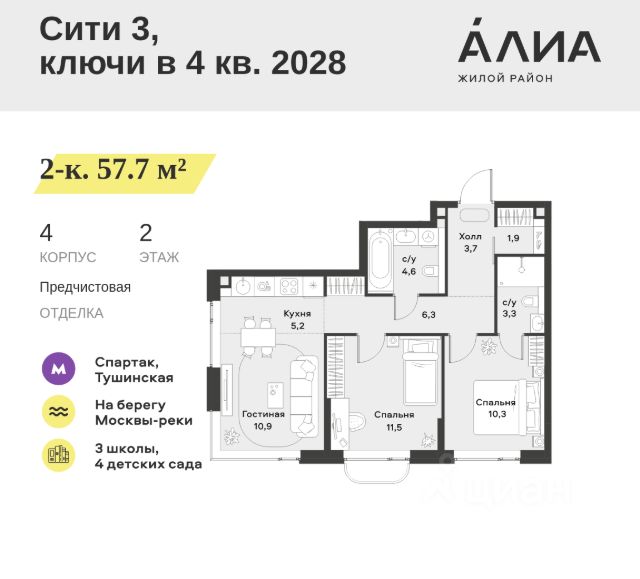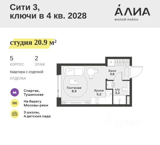Продаётся Студия 22.4 м². В жилом районе Алиа на 12-м этаже 28-этажного дома. Жилой район Алиа — это дома бизнес-класса у слияния Москвы-реки и Сходни. Алиа находится в Покровском-Стрешневе, экологически чистом районе на престижном северо-западе столицы. Район возводится на бывшей территории Тушинского аэрополя, где никогда не было промышленного производства. Алиа — это район разностороннего развития, спроектированный по принципу WORK.LIVE.PLAY.LEARN. Это "15-минутный город", где вся необходимая для комфортной жизни инфраструктура — на расстоянии приятной прогулки. У района удобное расположение: отсюда меньше 10 минут пешком до станций метро "Спартак" и "Тушинская" и всего полчаса на автомобиле до центра города или аэропорта Шереметьево. Архитектурную концепцию Алиа разработало бюро SOM (Skidmore, Owings & Merrill), авторы знаменитой "Бурдж-Халифа". В Алиа больше 140 планировочных решений, среди которых — редкие для Москвы форматы: квартиры с окном в ванной, пентхаус, сити-юниты и таунхаусы. Почти половина территории района отдана под благоустройство. В Алиа три парка: Линейный парк с кафе и магазинами, Центральный парк с амфитеатром, сухим фонтаном и большим плейхабом для детей всех возрастов и Прибрежный парк на собственной набережной, одной из самых длинных в Москве. В каждом урбан-блоке — закрытый внутренний двор с гипоаллергенными растениями и детской площадкой. В лобби каждого жилого корпуса в Алиа оборудована зона ожидания, колясочная, гостевой санузел и лапомойка для домашних животных. За стойкой ресепшена резидентов и их гостей встречает консьерж. Центральное лобби урбан-блока — это стильное общественное пространство с коворкингом, лаундж-зоной и кофе-пойнтом. Это "вторая гостиная" жителей урбан-блока и одно из мест, где формируется комьюнити Алиа. Два ключевых объекта инфраструктуры в Алиа — это спорткомплекс "Чкалов Арена", где представлены 25 видов спорта, и самый большой в стране бизнес-парк класса A, благодаря которому району обеспечено быстрое развитие.