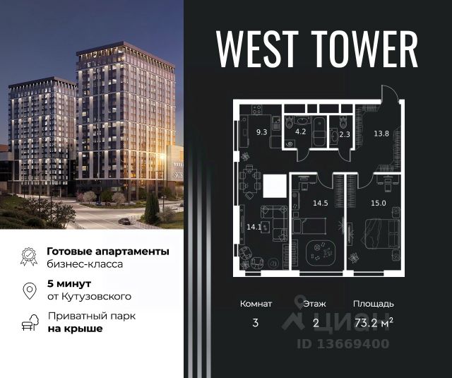 Этаж: 20, комнатность: 2 Площадь: 49.8 кв.м. Продаются апартаменты в многофункциональном комплексе бизнес-класса West Tower в ЗАО. 2 - комнатные апартаменты в West Tower это идеальные апартаменты для индивидуальности. Простор открытой планировки, в сочетании с инфраструктурой комплекса и отличной экологией вокруг дают отличную основу для покорения вершин. Здесь только самое необходимое. Эти апартаменты больше других подобных подходят для зонирования. Можно легко отделить хоум офис от кухни, а пространство для приема гостей от зоны отдыха. West Tower — апартаменты с премиальным сервисом на Аминьевском шоссе. Развитая инфраструктура и хорошая транспортная доступность. Рядом три станции метро: Аминьевская, Давыдково и Мичуринский проспект. У подножия коплекса находится Природный заказника Долина реки Сетунь, который дополнен собственным парком на крыше. Архитектура Строгий, харизматичный стиль проекта West Tower отражает в себе концепцию рационального проектирования и прагматичного подхода. Здесь все продумано до мельчайших деталей. Инфраструктура в доме Торговая галерея Kvartal West расположилась на первых этажах комплекса. Более 150 бутиков, кафе и рестораны, игровые центры, кинотеатр Синема Стар и премиальный фитнес-клуб World Class с бассейном. Комфорт и безопасность Премиальный консьерж-сервис 24/7, круглосуточная охрана, видеонаблюдение, система СКУД, закрытый охраняемый паркинг и эксклюзивное мобильное приложение для решения бытовых вопросов резидентов. Квартира в новостройке с отделкой на шоссе Аминьевское в Москве.