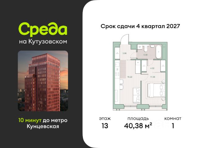 О квартире Продаётся однокомнатная квартира общей площадью 35.53 кв. м. с отделкой на выбор: черновая, White Box. Квартира на 11 этаже корпуса 5 в жилом комплексе бизнес-класса "Среда на Кутузовском". До метро "Кунцевская" 10 минут пешком. Исторический зелёный район "Среда на Кутузовском" строится в Кунцево - историческом и экологически чистом районе Москвы. Здесь нет крупных производств, много лесных массивов и роза ветров, которая обеспечивает приток чистого воздуха. Район наполнен жизнью и уже развит: много детских садов и школ, поликлиники, магазины, кафе, спортивные объекты, парки. - 10 минут пешком до станции метро "Кунцевская". - 5-8 минут на машине до Кутузовского проспекта и Можайского шоссе и 10-15 минут до Рублёвского и МКАД. - 15 минут езды до Крылатских холмов, Суворовского парка и заказника "Долина реки Сетунь". Акции и спецпредложения - Выгода 12%: если внести 100% оплату или оформить семейную ипотеку под 6%. Действует до 13 апреля. - Низкие ставки по ипотеке: 0,1% в первый год или 0,11% в первые два года кредита. - Трейд-ин от "Среды": можно обменять свою текущую квартиру на новую. - Ипотека для семей с детьми: если ребёнку до 7 лет, предлагаем льготную ставку 3,5% О жилом комплексе "Среда на Кутузовском" - новый квартал с башнями от 12 до 44 этажей, окружённый лесными массивами и историческими усадьбами старой Москвы. Во внутреннем дворе есть водоём, многоуровневые зоны с детскими и спортивными площадками, коворкинг на свежем воздухе и локации для уединённого отдыха. Особенности - Архитектура с многослойными фасадами. - Квартиры с террасами и мастер-спальнями. - Окна в пол на всех этажах. - Общественные лаунж-гостиные. - Собственный ландшафтный парк во дворе. - Зоны барбекю и площадки для отдыха у воды. - Умный подземный паркинг. - Стрит-ритейл на первых этажах. квартира в новостройке с отделкой в районе Кунцево в Москве.