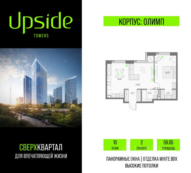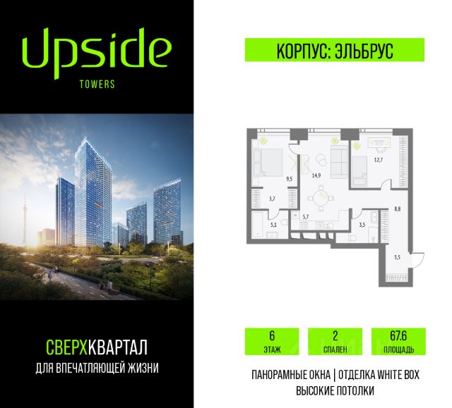 Продаётся 2-комнатная квартира площадью 63.24 кв.м на 3 этаже 46 этажного корпуса Монте Бьянко в квартале небоскребов "Upside Towers". В квартире отделка White-box, c видом на Звездный бульвар, Ольгинский храм, Останкинскую Башню. Номер квартиры Г0303. Upside Towers - технологичный квартал строится в динамично развивающемся Бутырском районе, в 3 мин. от метро, в 5 мин. от ТТК. На территории 7 га возводится 5 высотных башен от 19 до 58 этажей, названных в честь главных вершин земли. Квартиры с панорамными окнами в пол, высокими потолками и современными инженерными решениями. Благоустроенная зеленая территория включает: приватные дворы, природный комплекс, прогулочный бульвар, ландшафтный парк 2,5 га с сенсорным садом и многофункциональными игровыми и спортивными площадками. В корпусе откроется смотровая площадка для резидентов с панорамными видами на город, парки, Останкинскую башню, ВДНХ, Ботанический сад и Москву-Сити. На первых этажах корпуса Монте Бьянко разместятся: фитнес студия, салон красоты, центр превентивной медицины, образовательные классы, книжный магазин, аптека, фермерская лавка, а также келлеры для хранения сезонных вещей. В приватном закрытом дворе разместятся разнообразные площадки для прогулок, игр и отдыха. Визитной карточкой двора станет уникальная биометрическая игровая пещера со сказочными тоннелями, горками и космическими "мягкими" камнями с неизведанных планет. Планету Земля дети смогут исследовать в павильоне круглый год: объемная крыша укроет от солнца и дождя. Игровая пещера будет реализована в стиле "эмоциональная архитектура". Большое внимание в проекте уделяется созданию социальной инфраструктуры. В стилобатной части, между корпусами "Атлас" и "Олимп" разместится уникальное пространство закрытый клуб для жителей квартала Upside Club площадью 2 000 кв. м. Здесь разместятся: каминный зал с роялем, многофункциональная детская зона c двухуровневым игровым оборудованием для малышей и дошкольников, плей-рум для подростков, домашний кинотеатр, коворкинг, переговорные и лектории. На 47 этаже башни "Атлас" откроется SKY SPA Relax с расслабляющей атмосферой, джакузи, сауной, залами для релаксации и йоги. Собственники квартир смогут в любое удобное для них время забронировать посещение спа-зоны через смарт-приложение. На крыше стилобата разместится всесезонная BBQ патио-зона с верандой и закрытыми помещениями для приготовления и отдыха. Покупая квартиру даже самого минимального размера в Upside Towers, вы получаете в пользование 2 000 м² бесплатных общественных пространств. В рамках проекта строится государственная школа и детский сад, разместится более 15 000 кв.м. коммерческой инфраструктуры. Насыщенная социальная инфраструктура формирует множество сценариев для жизни на территории квартала. В Upside Towers применяются лучшие технологии и практики, чтобы обеспечить высшее качество жизни: Воздух, не уступающий по качеству горному, обеспечит приточно-вытяжная вентиляция. Пятиступенчатая очистка воды с сохранени Продается квартира в новостройке с отделкой рядом с метро Фонвизинская.