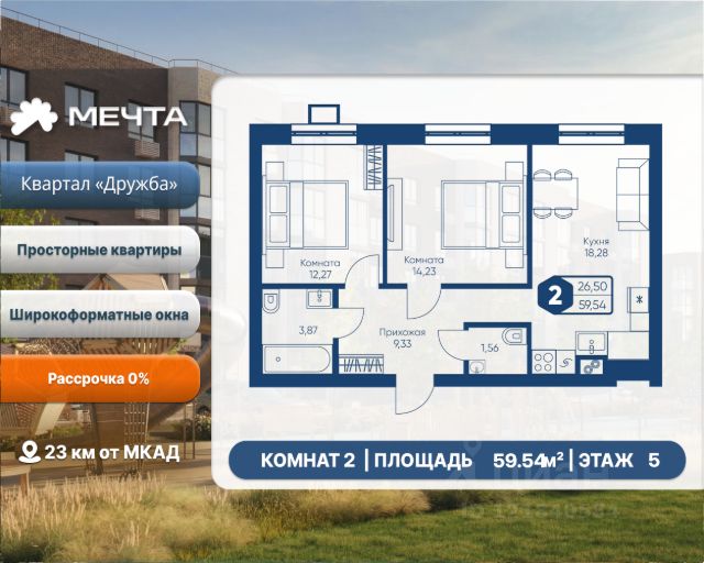 Рассрочка 0% от застройщика! Продается двухкомнатная квартира в квартале "Дружба" жилого комплекса "Мечта". Общая площадь квартиры: 59.54 кв. м, этаж 5 из 5. Срок сдачи: 4 квартал 2027 г. Отделка: Чистовая ОСОБЕННОСТИ: - Просторная кухня-гостиная - Продуманная планировка - Широкоформатные окна - 2 спальни - 2 санузла - Высота потолка: 2.7 метра Квартал "Дружба" состоит из пяти пятиэтажных домов с несколькими подъездами. Каждый дом оборудован широкими окнами, которые обеспечивают максимальный доступ естественного света и открывают прекрасный вид на окружающую природу. Квартал отличается большими застеклёнными лоджиями, которые позволяют наслаждаться свежим воздухом и красивым видом, не покидая своего жилища. Жилой комплекс "Мечта" расположен в 23 км от МКАД по Дмитровскому или Ленинградскому шоссе. ТРАНСПОРТНАЯ ДОСТУПНОСТЬ: - 15-20 минут на общественном транспорте до МЦД-1 "Лобня" - 30-35 минут на общественном транспорте до метро "Физтех" - 45-50 минут до станций метро "Савеловская" или "Белорусская" - 30 минут на автомобиле до Москвы Инфраструктура включает в себя муниципальную школу и детские сады, кабинет врача общей практики, множество кафе и ресторанов, а также различные спортивные и детские площадки. В пешей доступности от жилого комплекса расположены лес и три реликтовых озера — Долгое, Круглое и Нерское, а также реки Альба, Уча и Волгуша. Территория жилого комплекса закрыта для посторонних, находится под охраной и патрулируется. На въезде расположен КПП. Камеры видеонаблюдения работают круглосуточно на всей территории. Вы и ваши дети будете чувствовать себя в безопасности.