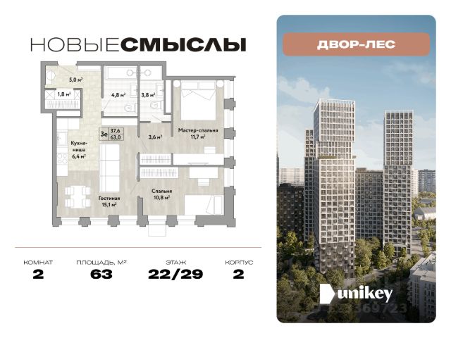 В жилом комплексе, расположенном по соседству с ландшафтным парком "Южное Бутово", продается 2-комнатная квартира площадью 53.20 кв. м. с отделкой. Квартира расположена на 7 этаже 2 корпуса в жилом квартале комфорт-класса "Новые Смыслы" (ГК Unikey/Юникей).