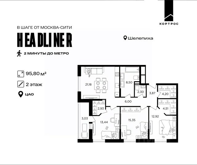 Указанная акционная стоимость доступна при 100% оплате или ипотеке без субсидирования. Цена действует до 07.10.2025 23:00:00. Стоимость без акции 46063600. Продаётся 2-комнатная квартира евроформата в ЖК HEADLINER, общей площадью 83,06 кв.м., на 11 этаже, предчистовая отделка. Высота потолков 3 м. 2 санузла. Гардеробная комната. Просторная кухня-гостиная. Ниша для гардеробной. Окна в квартире выходят на разные стороны. Виды: • на Москва-Сити • на двор Высота потолков 3.1 м. Дом сдан. Квартал HEADLINER находится в Пресненском районе ЦАО, рядом с м. "Шелепиха". В непосредственной близости Москва-Сити. Рядом находятся парк Причальный и Шелепихинская набережная. За 5-10 минут на автомобиле можно добраться до парков Фили, Красногвардейские пруды, Красная Пресня и парка Победы. В пешей досягаемости - ТРЦ "Афимолл Сити", ТРЦ "Филион", ТРЦ "Европейский", World Class, а также вся инфраструктура ММДЦ "Москва-Сити". На территории ЖК расположен филиал частной аккредитованной школы полного дня "Путь к успеху". В непосредственной близости расположены лучшие школы ЦАО: ГБОУ "Романовская школа", физико-математическая школа 56 им. академика В.А. Легасова, школа с углубленным изучением английского языка 1232 "На Кутузовском". Особенности ЖК: - Потрясающие видовые характеристики открываются на "Москва-Сити", Москву-реку и панораму центра столицы; - 8 минут пути до набережной Тараса Шевченко с живописными видами на Headliner и Деловой центр; - Разная высота корпусов: от 5 до 51 этажа с уникальным внешним видом; - Потолки от 3 м; - Доступны варианты как с отделкой white box, так и без нее; - 80% квартир имеют ширкоформатные окна; - Вместительный двухуровневый подземный паркинг с кладовыми; - Лаунж-зоны с каминами и стильной мебелью; - Колясочные и гостевые уборные; - Концепция "дворы без автомобилей"; - Консьерж-зоны в подъездах; - Видеонаблюдение, круглосуточная охрана.