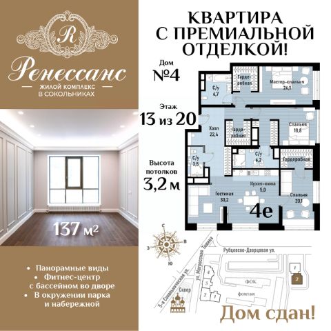 Жилой комплекс премиум-класса "Ренессанс" расположен на Рубцовско-Дворцовой улице исторического района Сокольники, в неск. мин. ходьбы от знаменитого парка "Сокольники", где круглый год можно прекрасно проводить время всей семьей. Квартиры продаются с полной отделкой, что обеспечивает комфорт проживания в доме сразу после получения ключей, т.к. исключает длительный период ремонта квартир - у вас и соседей, а также сохраняет презентабельные входные группы в идеальном состоянии. Премиальная отделка квартир "под ключ" выполнена европейскими специалистами по эксклюзивным дизайн-проектам с использованием дорогих материалов: экологичное напольное покрытие - инженерная доска TRIO на хвое (материал - дуб) и керамогранит KERAMA MARAZZI с обогревом пола, стяжка пола с шумоизоляцией, современные системы кондиционирования и сантехническое оборудование премиум-класса - Villeroy Boch, Grohe, Geberit Duofix, выключатели и розетки - Berker. Высокие потолки - 3,2 м и входные двери квартир - 2,4 м со вставками из массива дуба, выполненные в едином стиле, подчеркивают премиальный статус владельцев. Из панорамных окон премиального бренда Schuco открываются завораживающие виды на сияющие в лучах солнца купола церквей и храмов, зелень легендарного парка "Сокольники" и национального парка "Лосиный остров", излучины реки Яузы с величественной гранитной набережной, старинные здания, среди которых дворец императрицы Елизаветы Петровны, небоскребы "Москва-Сити", Останкинскую телебашню и приватную, охраняемую территорию комплекса с концепцией "двор без машин", изысканным ландшафтным дизайном, богатой коллекцией растений, пространствами для отдыха с роскошным фонтаном с красивой подсветкой, элегантной перголой, большими шахматами, детскими городками и спортивными площадками. Роскошный интерьер лобби: натуральный испанский мрамор, вертикальный фонтан, репродукции картин эпохи Возрождения, великолепная итальянская люстра ручной работы с подвесками из хрусталя CutCrystal и муранского стекла, иранские ковры, дизайнерская мебель. Лифты премиум-класса ThyssenKrupp. Консьерж-сервис. На этажах мусорокамеры закрытого типа. Из квартиры можно связаться с консьержем по видеодомофону британской компании BAS-IP. Уникальная транспортная доступность: 5 мин. на авто до ТТК и Русаковской эстакады, 10 мин. - до Садового кольца и ул. Земляной Вал, 15 мин. - до Кремлевской наб. В шаговой доступности - ст. м. и БКЛ "Сокольники" и "Электрозаводская". Развитая собственная инфраструктура: подземный паркинг, здание фитнес-центра с бассейнами, объекты торговли и сферы услуг. Отличная инфраструктура респектабельного района Сокольники: детсады, элитные общеобразовательные, музыкальные и спортивные школы, ТЦ и т.д.