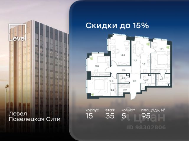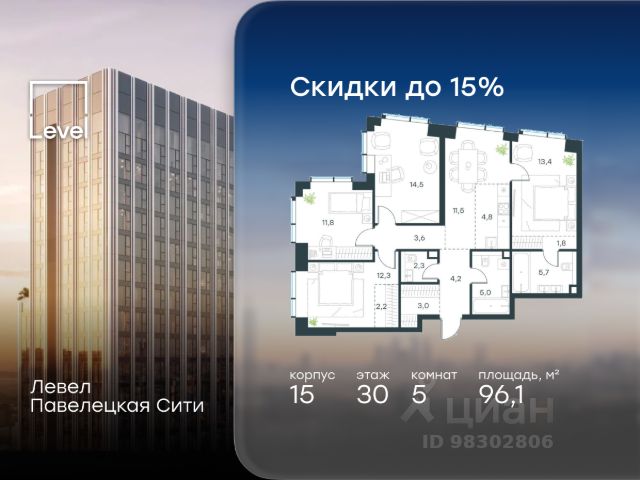 В Даниловском районе столицы (ЮАО) продаётся многокомнатная квартира площадью 96.10 кв.м c предчистовой отделкой. Квартира расположена на 30 этаже 45-этажного корпуса 15 в жилом комплексе бизнес-класса Левел Павелецкая Сити. Высота потолков 3.00м.