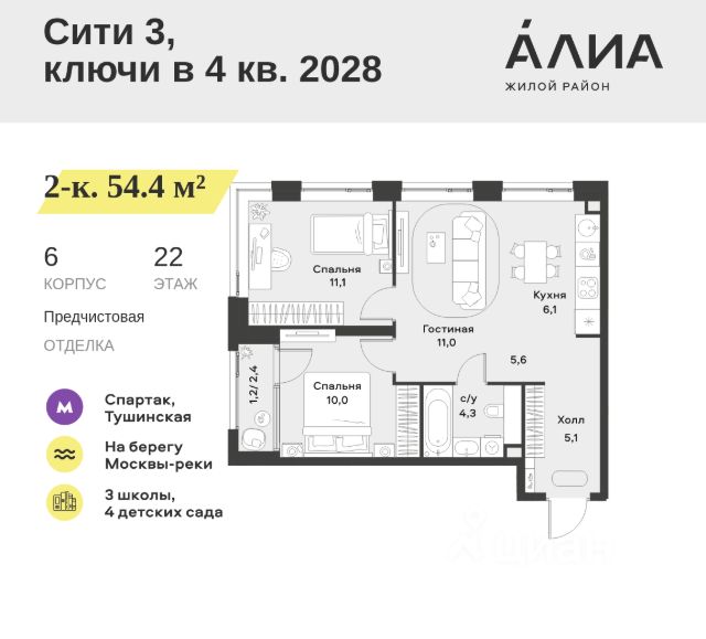 Продаётся 2-комнатная квартира 72.8 м². В жилом районе Алиа на 16-м этаже 28-этажного дома. Жилой район Алиа — это дома бизнес-класса у слияния Москвы-реки и Сходни. Алиа находится в Покровском-Стрешневе, экологически чистом районе на престижном северо-западе столицы. Район возводится на бывшей территории Тушинского аэрополя, где никогда не было промышленного производства. Алиа — это район разностороннего развития, спроектированный по принципу WORK.LIVE.PLAY.LEARN. Это "15-минутный город", где вся необходимая для комфортной жизни инфраструктура — на расстоянии приятной прогулки. У района удобное расположение: отсюда меньше 10 минут пешком до станций метро "Спартак" и "Тушинская" и всего полчаса на автомобиле до центра города или аэропорта Шереметьево. Архитектурную концепцию Алиа разработало бюро SOM (Skidmore, Owings & Merrill), авторы знаменитой "Бурдж-Халифа". В Алиа больше 140 планировочных решений, среди которых — редкие для Москвы форматы: квартиры с окном в ванной, пентхаус, сити-юниты и таунхаусы. Почти половина территории района отдана под благоустройство. В Алиа три парка: Линейный парк с кафе и магазинами, Центральный парк с амфитеатром, сухим фонтаном и большим плейхабом для детей всех возрастов и Прибрежный парк на собственной набережной, одной из самых длинных в Москве. В каждом урбан-блоке — закрытый внутренний двор с гипоаллергенными растениями и детской площадкой. В лобби каждого жилого корпуса в Алиа оборудована зона ожидания, колясочная, гостевой санузел и лапомойка для домашних животных. За стойкой ресепшена резидентов и их гостей встречает консьерж. Центральное лобби урбан-блока — это стильное общественное пространство с коворкингом, лаундж-зоной и кофе-пойнтом. Это "вторая гостиная" жителей урбан-блока и одно из мест, где формируется комьюнити Алиа. Два ключевых объекта инфраструктуры в Алиа — это спорткомплекс "Чкалов Арена", где представлены 25 видов спорта, и самый большой в стране бизнес-парк класса A, благодаря которому району обеспечено быстрое развитие.
