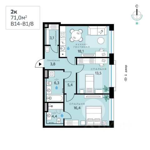 В продаже — двухкомнатная квартира с чистовой отделкой, общей площадью 71 кв. м. Квартира расположена на втором этаже десятиэтажного корпуса Балансд в квартале В14 нового района СберСити, который строит Сбер. Архитектуру корпусов квартала разработало итальянское бюро. В облике отражена природная палитра: для фасадов выбраны небесно-голубой и травянистый зелёный оттенки. Декоративные металлические рамы окон и эркеры служат выразительными акцентами. Из окон открываются виды на парк и закаты над рекой. Всего в трёх минутах пешком — набережная, а рядом — главный парк СберСити. Во дворах без машин — много зелени, деревьев, кустарников и многолетних растений, детские площадки и тихие зоны отдыха. Дом возводится по технологии монолитного строительства. Фасады отделываются терракотовыми и алюминиевыми композитными панелями. В квартирах будет установлена система "умный дом", объединяющая управление квартирой, домом и прилегающей территорией. Жильцы смогут регулировать климат и освещение голосом или со смартфона, а также управлять сценариями освещения по заданным параметрам. Повышенная шумоизоляция и двухкамерные стеклопакеты с алюминиевым профилем обеспечивают комфорт и тишину. В санузлах установлен тёплый пол. В доме предусмотрены: уютное лобби, лапомойка, колясочная и велосипедная комната на первом этаже, подземный паркинг. СберСити — это новый жилой и деловой район на западе Москвы, в одном из самых экологически чистых и престижных мест столицы. Это первая в России и крупнейшая в мире инновационная городская среда, созданная по международным стандартам зелёного проектирования. Здесь внедряются решения в области энергоснабжения, вакуумного мусороудаления, тестирования зелёных технологий, а в дальнейшем — системы искусственного интеллекта для управления домами и городской инфраструктурой. Строительство проекта началось в 2021 году, заселение первых корпусов — с лета 2024-го. Общая площадь территории — 461 га, из них более 2,5 млн кв. м жилья и около 833 тыс. кв. м офисных пространств. Будет построено 7 школ, 13 детских садов и 2 поликлиники. В СберСити будут жить 65 тыс. человек и работать 70 тыс. Развитием территории занимается АО "Рублёво-Архангельское", входящее в группу Сбер. СберСити — место, где хочется жить, работать и растить детей. Переезжайте в СберСити!