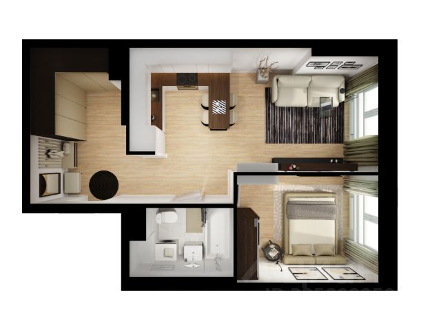 Проектная площадь с учетом лоджии составляет 66.18 м², жилая: комната 1-16,85 м², комната 2-15,98 м², лоджия- 3,90 м².