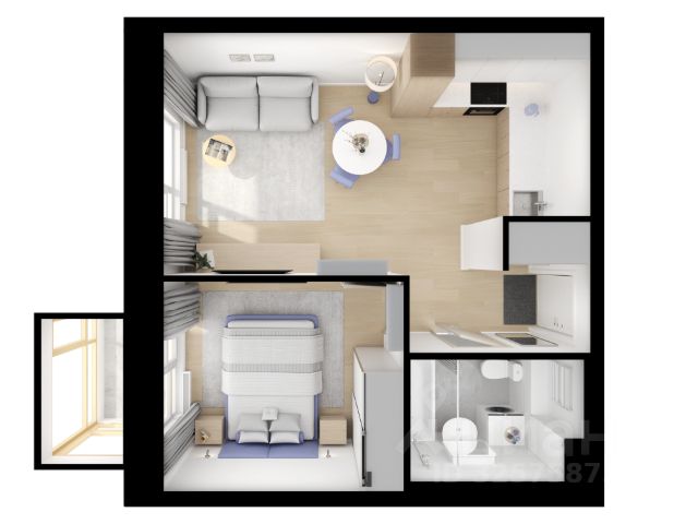 Продуманная планировка: Просторная кухня-гостиная 16 м², большие окна, функциональное пространство.