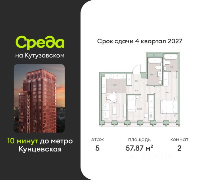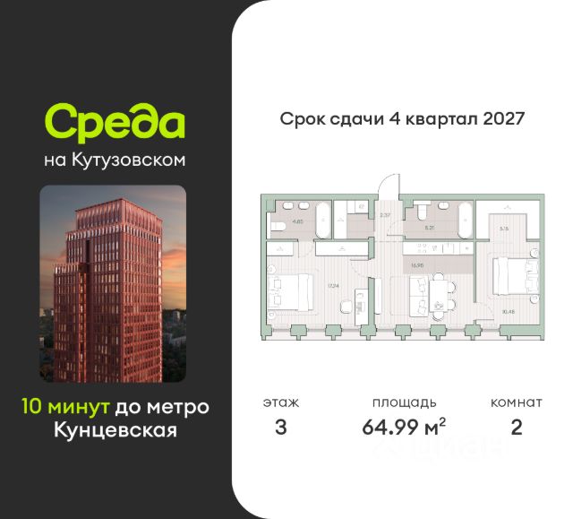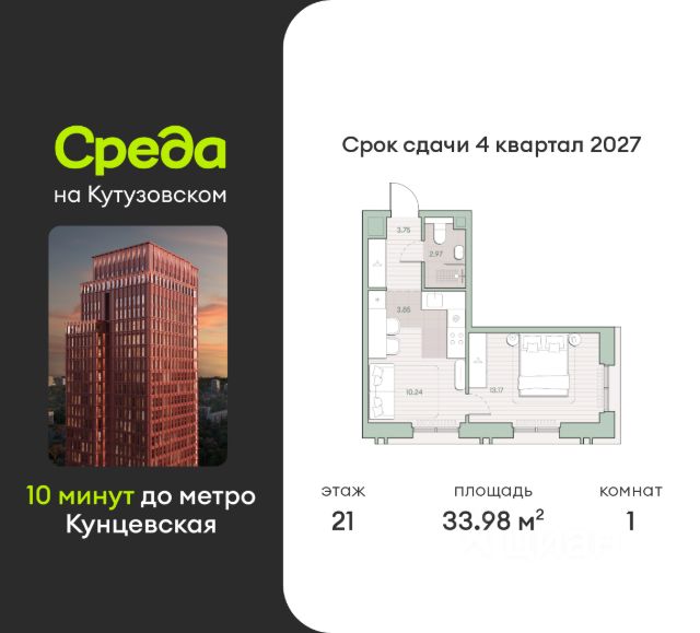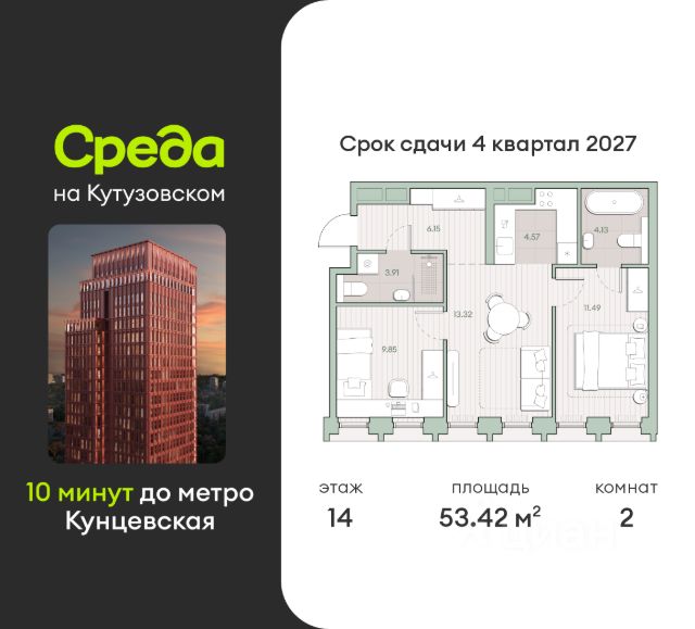 О квартире Продаётся 2-комнатная квартира общей площадью 63.54 кв.м. с отделкой white box. Квартира расположена на 13 этаже корпуса 4.1 в жилом комплексе бизнес-класса "Среда на Кутузовском" в пешей доступности от метро "Кунцевская". О жилом комплексе Комплекс предназначен для людей, которые ставят в приоритет свой комфорт, умеют прислушиваться к себе и понимают, что нужно для внутренней гармонии. Это проект для тех, кто ценит свое время и использует его правильно. Для тех, кто умеет радоваться тому, что есть. "Среда на Кутузовском" — личное место силы и гармонии в двух шагах от центра города. Инфраструктура Жилой комплекс строится в престижном и зеленом Кунцево. Здесь расположены различные торговые центры, престижные учебные заведения (МГУ, РЭУ им. Плеханова, Финансовый университет при Правительстве РФ, РУДН) медицинские клиники. Представлены широкие возможности для поклонников разных видов спорта: от бега в ближайших парках и велозаездов до гребли, баскетбола, футбола, хоккея, фигурного катания и катания на лыжах. На каждый день подойдет World Class с открытым бассейном — он находится всего в 1 минуте от дома. Выбор мест для прогулок также разнообразен: Суворовский парк, лесной массив Крылатских холмов, Москворецкий парк и природный заказник "Долина реки Сетунь". 10 мин пешком: -м. Кунцевская -вся необходимая инфраструктура До 15 мин на авто: -Северо-Западная хорда -Кутузовский проспект -Рублевское шоссе -МКАД -Можайское шоссе Особенности Проект сочетает в себе ритмичность и динамичность, благодаря своей архитектуре, при он этом окружен зеленью и парками. "Среда на Кутузовском" погружает в активный и разнообразный образ жизни, дает вариативные возможности досуга и вдохновляет на новые свершения. —Зоны отдыха у воды —Принцип многослойности в архитектуре —Зона барбекю —Пентхаусы —Умный паркинг —Гайдбук по управлению умным домом —Окна в пол на всех этажах