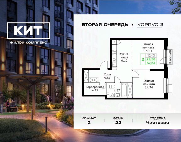 Продаётся 2-к квартира 57.23 кв.м. с чистовой отделкой в ЖК "КИТ2" на 22-м этаже 25 этажного дома.Жилой комплекс "Кит 2" спроектирован в урбанистической концепции "Город в Городе". Объект бизнес-класса предлагает рациональный подход к набору опций, необходимых для гармоничной жизни. Проект представляет собой два корпуса, которые образуют единую приватную территорию. Ее доминантой является двор с красивым ландшафтным дизайном и различными зонами, ориентированными на интересы жителей разного возраста. При создании пространства в приоритет ставился комфорт жителей. В шаговой доступности находятся: торговый центр, рестораны, кинотеатры, спортивный зал, образовательные учреждения и множество других объектов в сфере услуг. Преимущества проекта: - 3 корпуса для приватной жизни - Видовые характеристики (просматриваются Москва - Сити и Останкинская телебашня) - Широкая квартирография по всем типам квартир - Увеличенное остекление - 3 варианта отделки: БОРДО, СТОКГОЛЬМ, ОСЛО - Богатая развлекательная инфраструктура - Высокий уровень безопасности территории Расположение комплекса: - 2,2 км до Волковского шоссе - 2,8 км до Ярославского шоссе - 5,7 км до МКАД - 5 минут пешком до ж/д станции "Мытищи" и Автовокзала - 18 минут до станции метро "Комсомольская" - 30 минут до станции метро "Медведково"