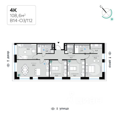 В продаже — четырехкомнатная квартира с чистовой отделкой, общей площадью 117,7 кв. м. Квартира расположена на восьмом этаже шестиэтажного корпуса класса Балансд в квартале В17 нового района СберСити, который строит Сбер. Всего в доме — 102 квартиры. Архитектуру корпусов квартала разработало итальянское бюро. В облике В17 читаются черты современной голландской архитектуры: фасады домов класса Балансд облицованы ярким кирпичом и клинкерной плиткой, над первым этажом проходит декоративный пояс из фигурной кладки. Французские балкончики чередуются с широкими окнами, создавая гармоничный ритм. Во дворах — ландшафтные композиции, детские и спортивные площадки, зона для йоги, прогулочные дорожки и места отдыха. Рядом расположены детский сад, парк и набережная Москвы-реки. В квартирах предустановлена система "умный дом" — комплекс решений, объединяющий квартиру, дом и прилегающую территорию. Жильцы могут регулировать климат и освещение голосом или со смартфона, установлена защита от протечек. Проведены работы по улучшению шумоизоляции, установлены двухкамерные стеклопакеты с алюминиевым профилем и скрытыми створками. В санузлах — тёплый пол. Квартал В17 состоит из шести корпусов переменной этажности (от 1 до 10 этажей) и 491 квартиры. Корпуса объединены общей подземной частью, где расположен паркинг на 309 автомобилей, места для мотоциклов и более 400 кладовых помещений. На первом этаже дома — уютное лобби, лапомойка, колясочная и велосипедная комната. СберСити — это новый жилой и деловой район на западе Москвы, в одном из самых экологически чистых и престижных мест столицы. Это первая в России и крупнейшая в мире инновационная городская среда, созданная по международным стандартам зелёного проектирования. Здесь внедряются решения в области энергоснабжения, вакуумного мусороудаления, тестирования зелёных технологий, а в дальнейшем — системы искусственного интеллекта для управления домами и городской инфраструктурой. Строительство проекта началось в 2021 году, заселение первых корпусов — с лета 2024-го. Общая площадь территории — 461 га, из них более 2,5 млн кв. м жилья и около 833 тыс. кв. м офисных пространств. Будет построено 7 школ, 13 детских садов и 2 поликлиники. В СберСити будут жить 65 тыс. человек и работать 70 тыс. Развитием территории занимается АО "Рублёво-Архангельское", входящее в группу Сбер. СберСити — место, где хочется жить, работать и растить детей. Переезжайте в СберСити!