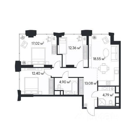 Продаётся 3-комнатная квартира 490, площадью 63,17 м², на 24 этаже в ЖК "Гранель Коломенское" корпус 1. Стоимость — от 27645391 руб. Квартира white box, планировка угловая, окна во двор.