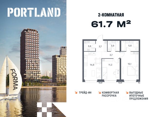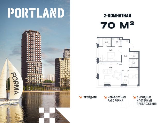 Цены указаны с условием 100% оплаты и стандартной ипотеки. Продаётся 2-к. квартира, 8 этаж в жилом комплексе бизнес-класса Portland от девелопера FORMA. ЖК расположен на берегу Москвы-реки в северной части района Печатники в акватории Южного речного порта. Основные преимущества проекта: • Самая протяженная береговая линия реки в Москве 13 км. • Вид на реку в сторону запада панорамные окна на самое широкое водное пространство Москва-реки (900 м) и на закат. • 95% квартир с видом на воду. • К Portland не примыкает крупных автомагистралей - отсутствие фонового шума дорог. • В перспективе ближайших 11 лет на территории района запланировано грандиозное преобразование и комплексное развитие. • Собственная набережная длиной 412 м., которая после завершения строительства сомкнется с эко-парком Печатники. • Прямой выход к воде и отсутствие проезжей части между Portland и береговой линией. • Инфраструктурное разнообразие: супермаркеты, крупные торговые центры, рестораны, кафе, фитнес-клубы, бьюти-салоны, компании сферы услуг и многое другое. • Собственная школа на 300 мест и детский сад на 275 мест. • Паркинг на 650 м/м • Транспортная вседоступность: метро, авто, велосипед, речной трамвай, канатная дорога • 15 мин. пешком до м. Печатники, 15 мин. на авто до ТТК, 20 минут на авто до Садового кольца